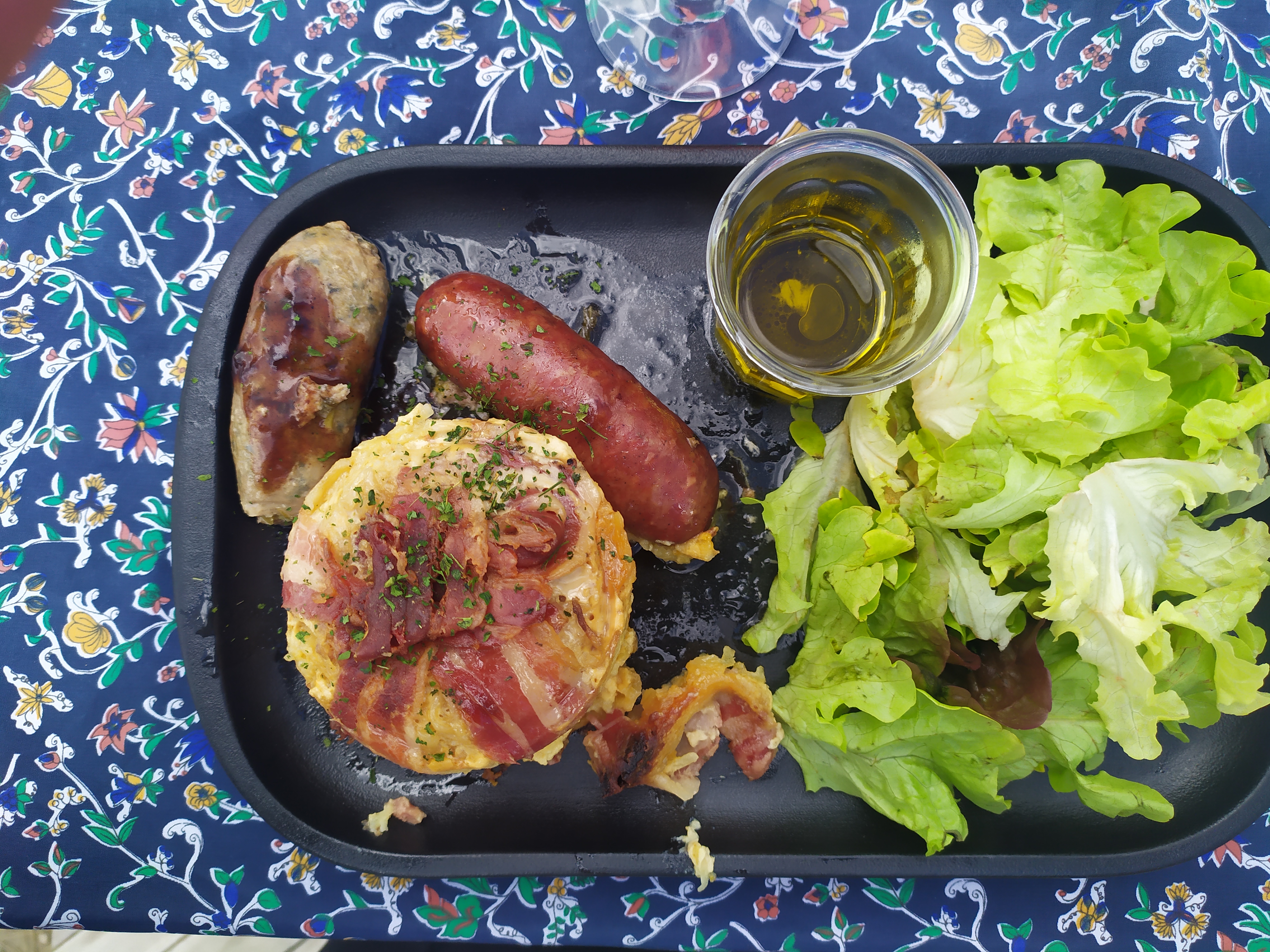 Mauvaise tartiflette, pdt coupées en deux non épluchées, crème en majorité, trois lardons..la honte pour la région, la patronne qui me demande de venir demain expliquer au chef à 10h comment on la fait lol... on passera sur l'arnaque de l'eau à la source pour nous faire acheter de l'eau en bouteille.
