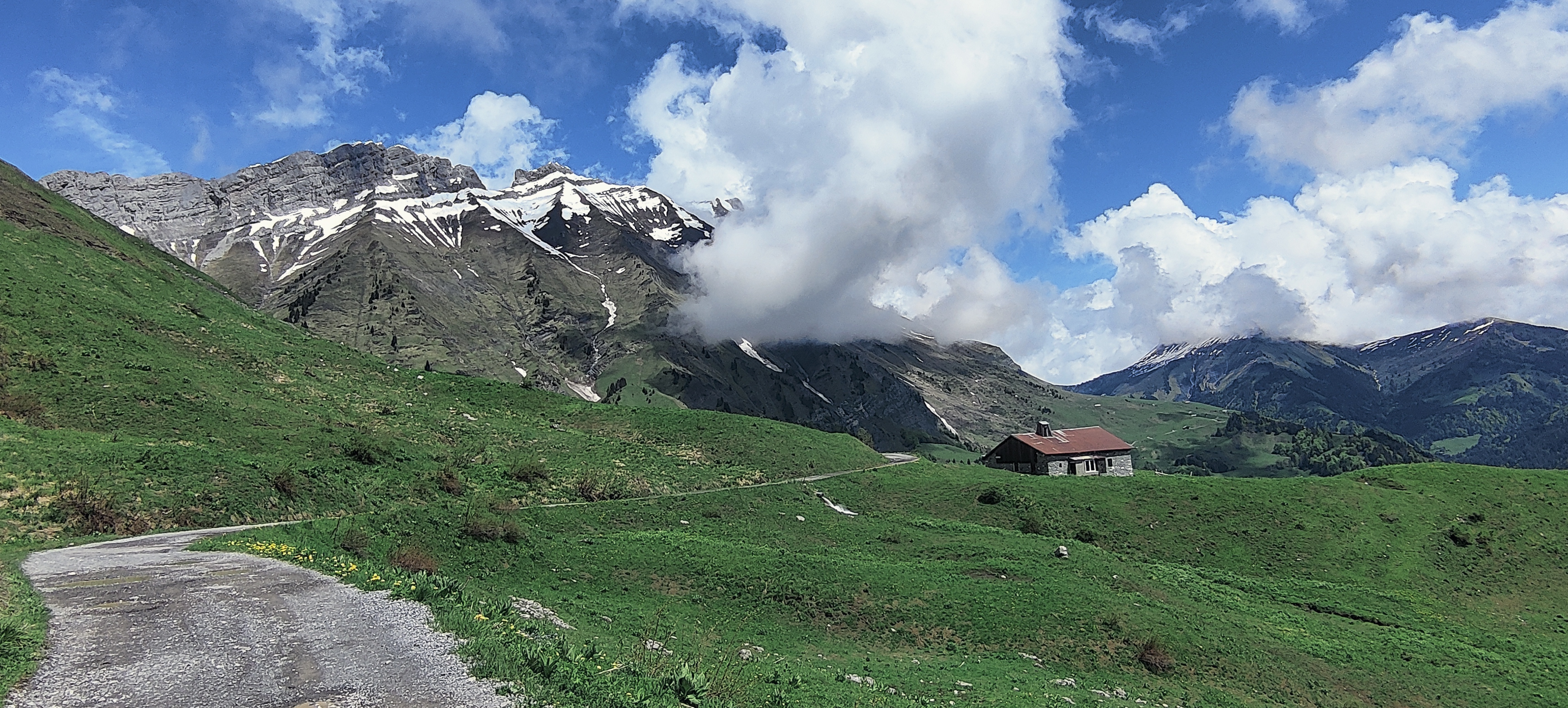 Lieu magique à quelques minutes du col des Aravis. Une route que l'on fait facilement avec un trail (moto). On mange bien et on contemple le mont-blanc.