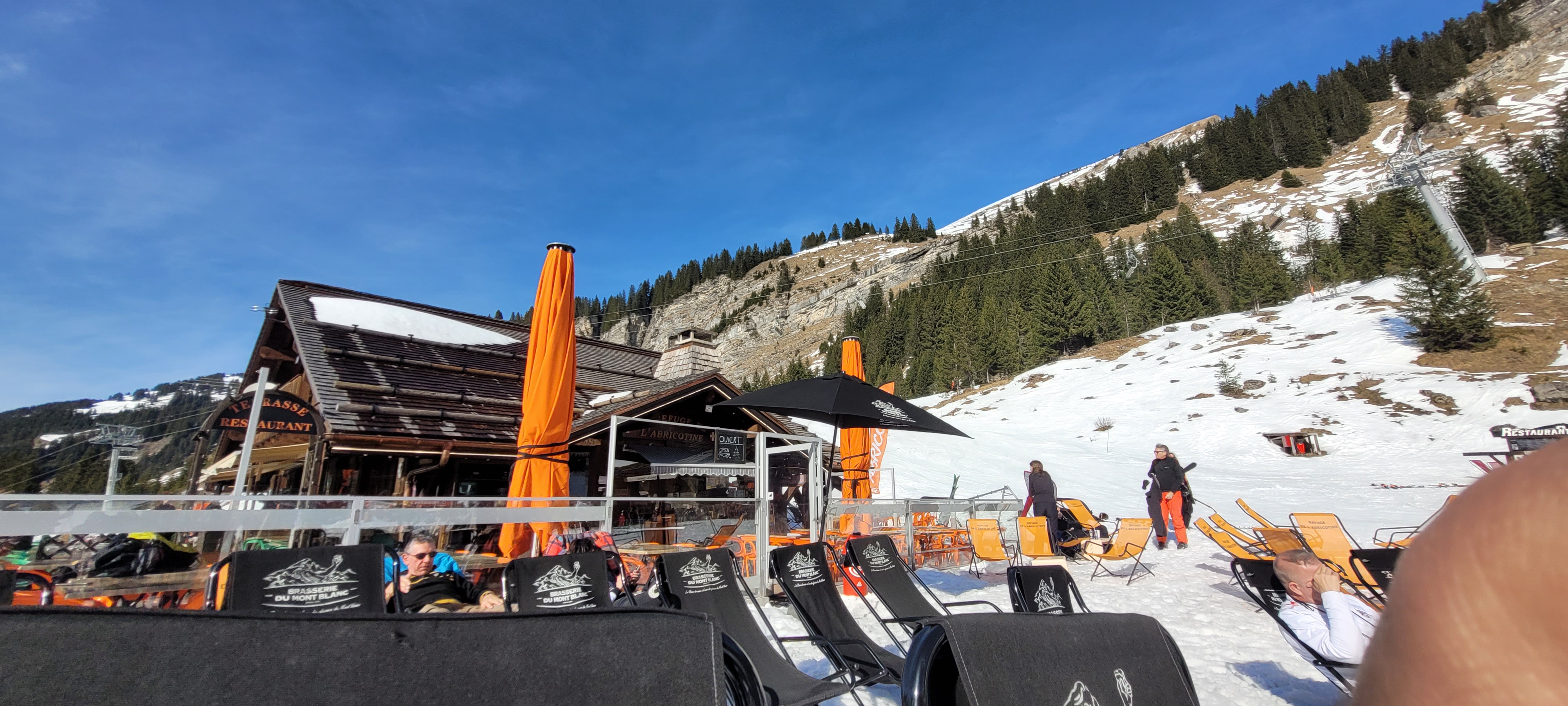 Belle terrasse, dommage que le soleil passe derrière la montagne et oblige à quitter la chaise longue car il fait trop froid. Moralité il faut y venir le matin et midi jusqu'à 15h30 en hiver.