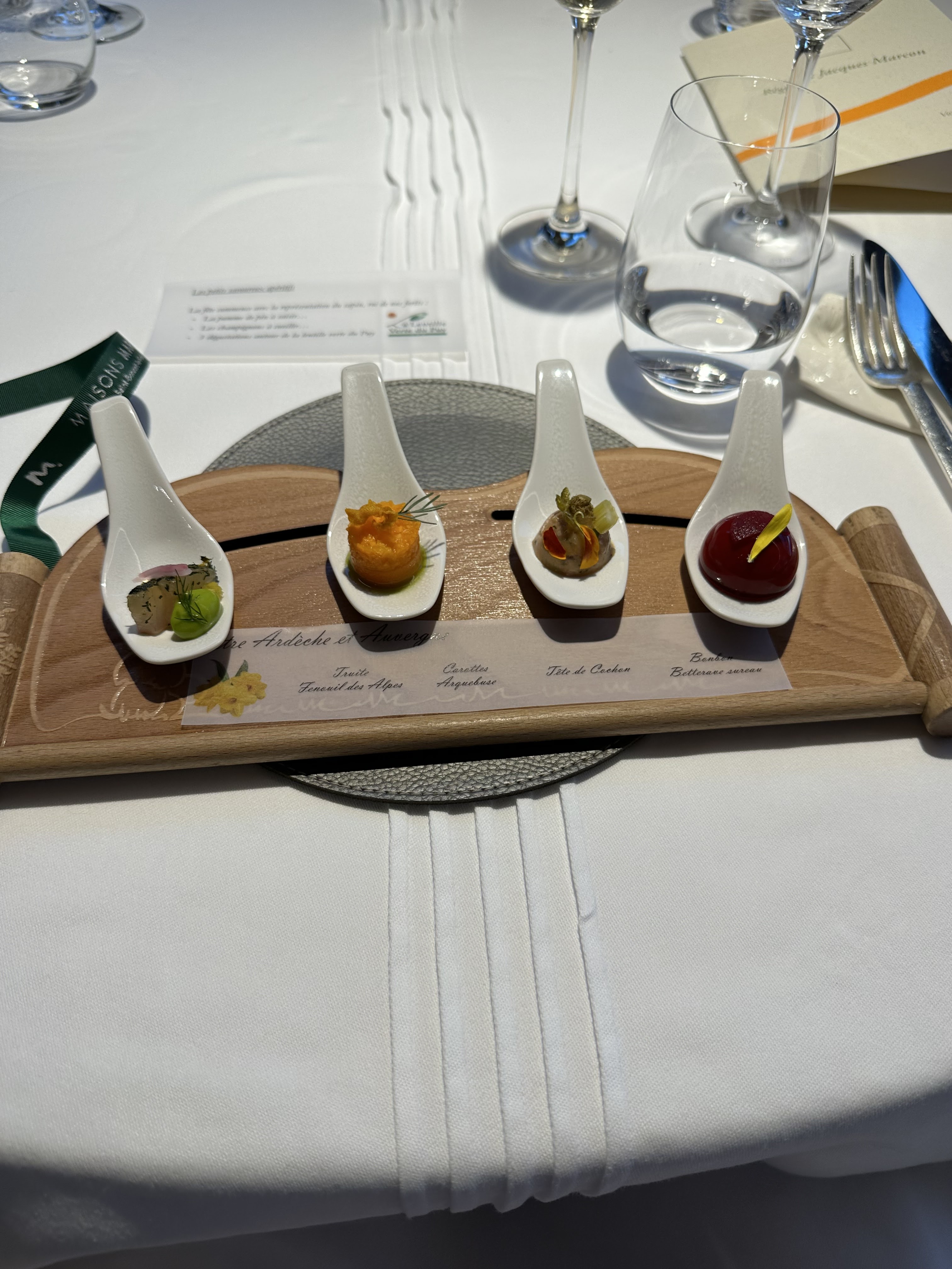 Un voyage hors du temps passé chez Regis et Jacques Marcon. Nous souhaitions remercier l’ensemble du personnel de nous avoir transporté dans cet univers. Le repas était fantastique, bien dosé et plein de sensations ! Nous avions choisi de prendre la nuit d’hôtel ainsi que le spa le lendemain et ce fut un très beau week-end. Nous reviendrons mais cette fois-ci sur une autre des quatre saisons 😊