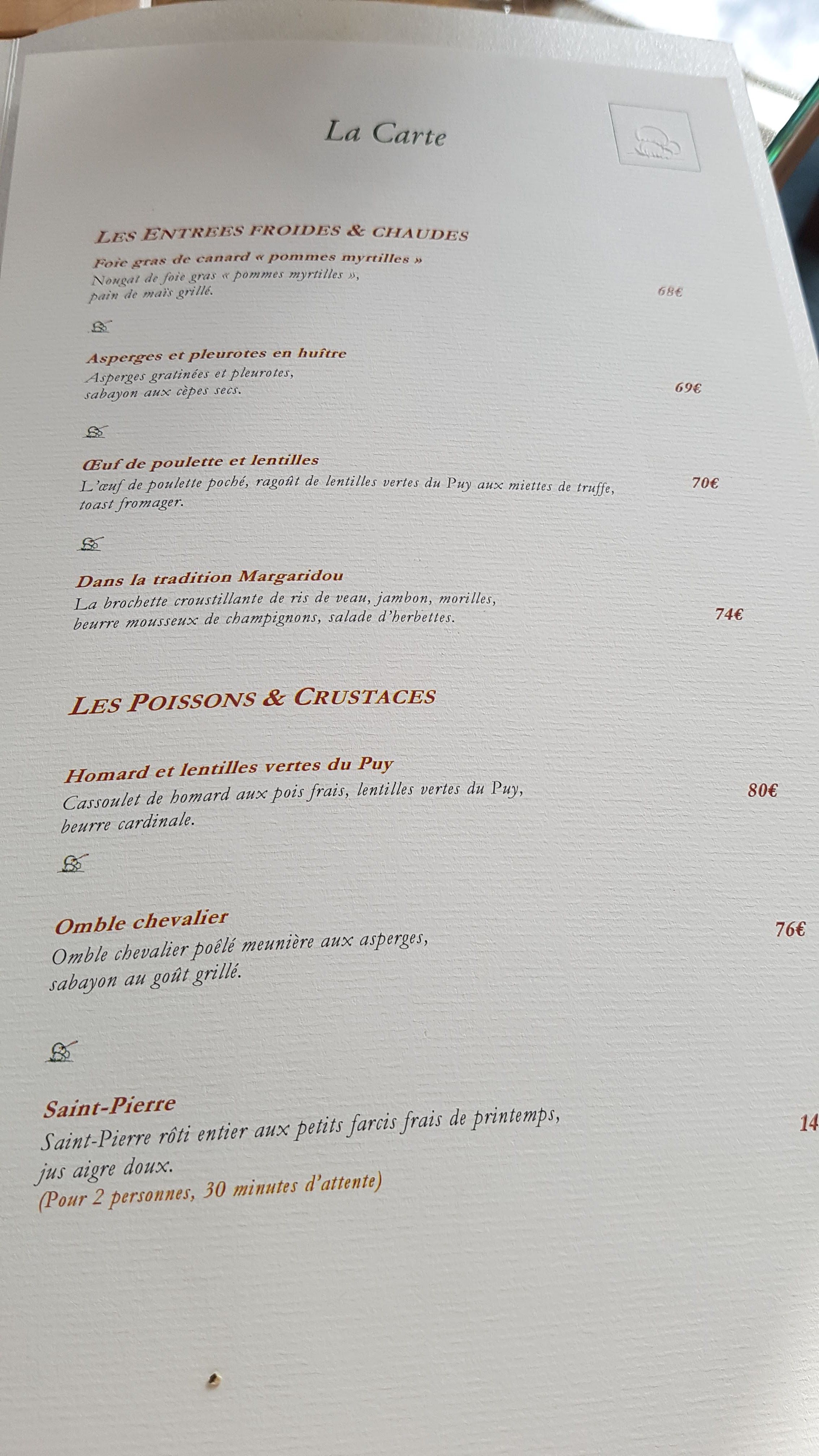Menu dégustation évidemment excellent et très équilibré. De belles découvertes, de très belles assiettes et un voyage dont on sort rassasié sans que ce soit trop non plus. Mention spéciale également pour le chef Régis Marcon qui passe sa soirée au milieu de ses hôtes et avec qui discuter est un plaisir. Petite déception en revanche du côté de la sommellerie dans le cadre de l'accord mets et vins : on choisit cette alternative pour l'accord certes, mais également pour discuter avec des professionnels. Ce soir là, cela n'aura pas été le cas et nous n'aurons eu qu'un très bref échange en tout début de repas. La proposition d'alternatives aux vins proposés est également laborieuse. Service un peu distant au début mais qui s'est progressivement fait plus affable. Une erreur grossière d'addition (vin en trop) pour terminer. Dommage lorsqu'on laisse déjà une si belle somme.