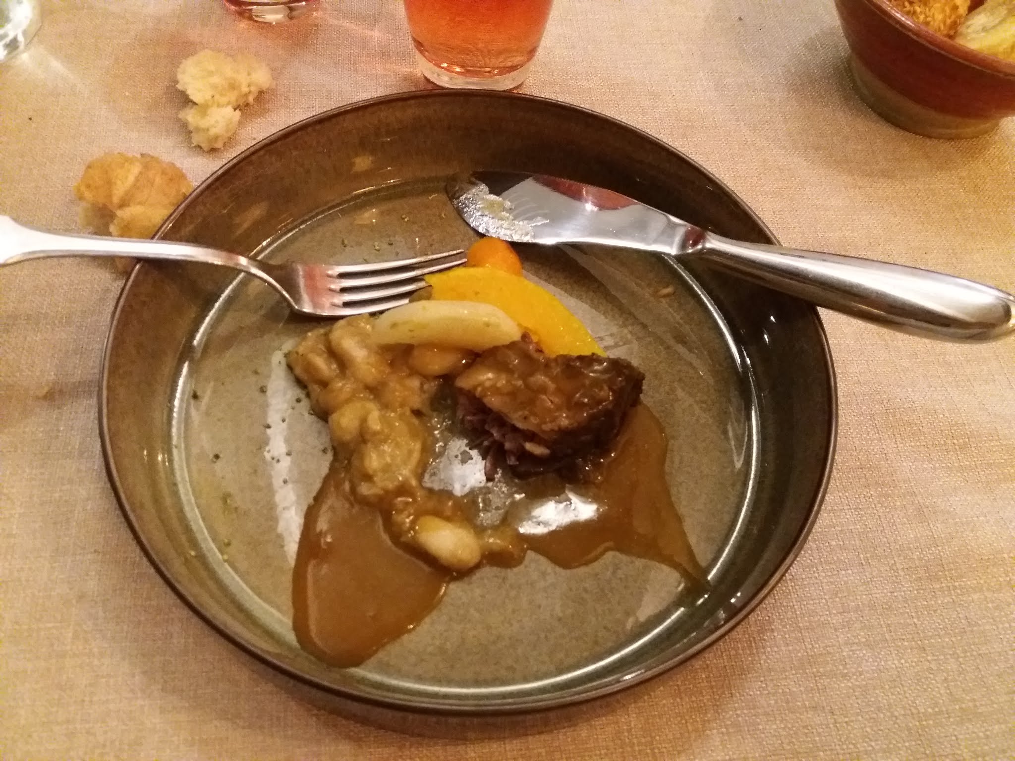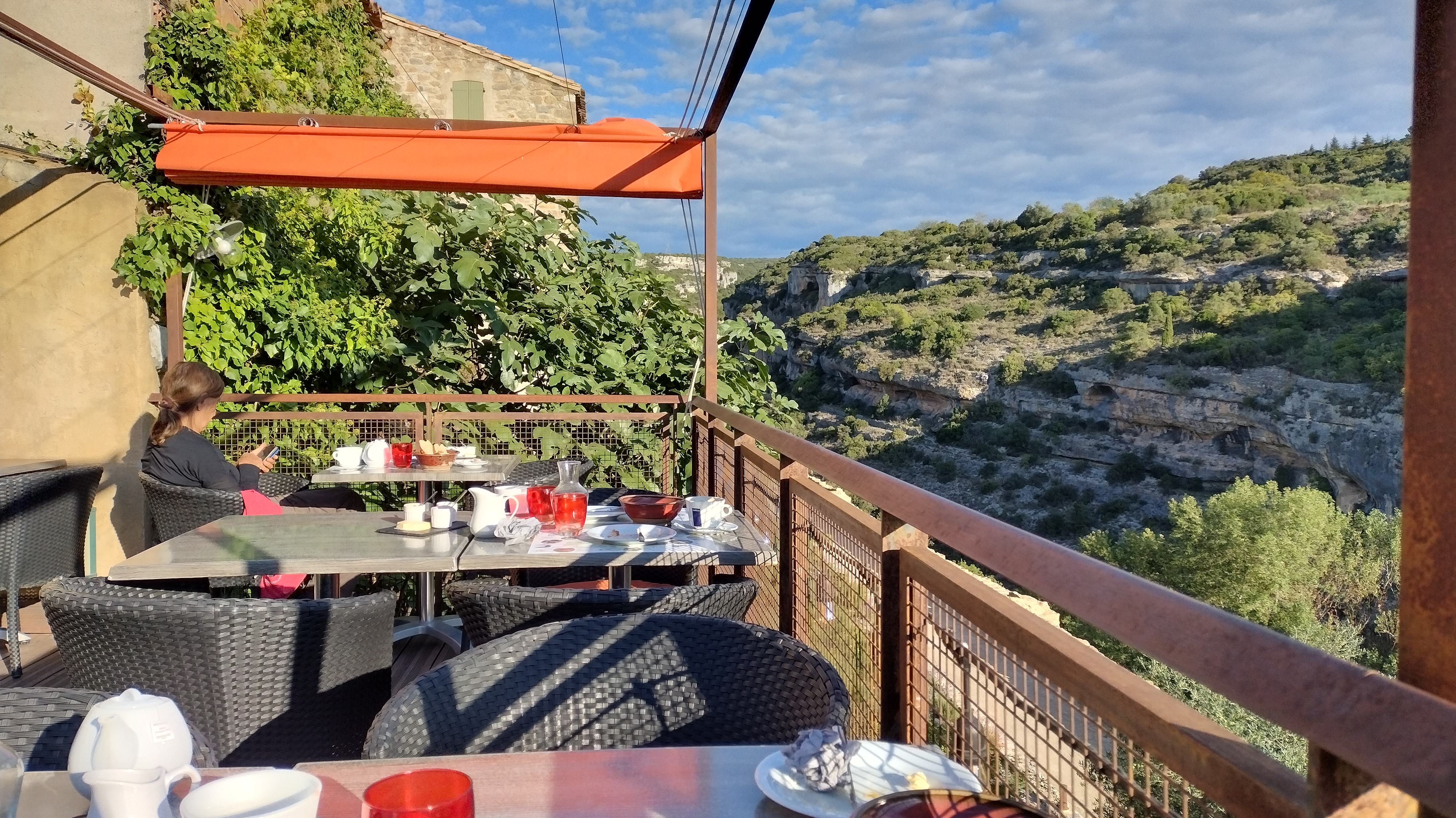 Quelle splendide terrasse surplombant les gorges du Brian. Dommage que la toile orangée qui protège du soleil ne permette pas de faire des photographies correctes. La cuisine est inventive, le rapport qualité prix sympathique (menus à 29 et 44€). Le financier salé servi à l’apéritif était bien réalisé avec ses pignons croquants , ses épices et son pavot grillé. Mon thon tataki était cuit à la perfection et je le recommande vivement. Le fondant au chocolat était accompagné d’une glace maison aux noisettes et c’était excellent.