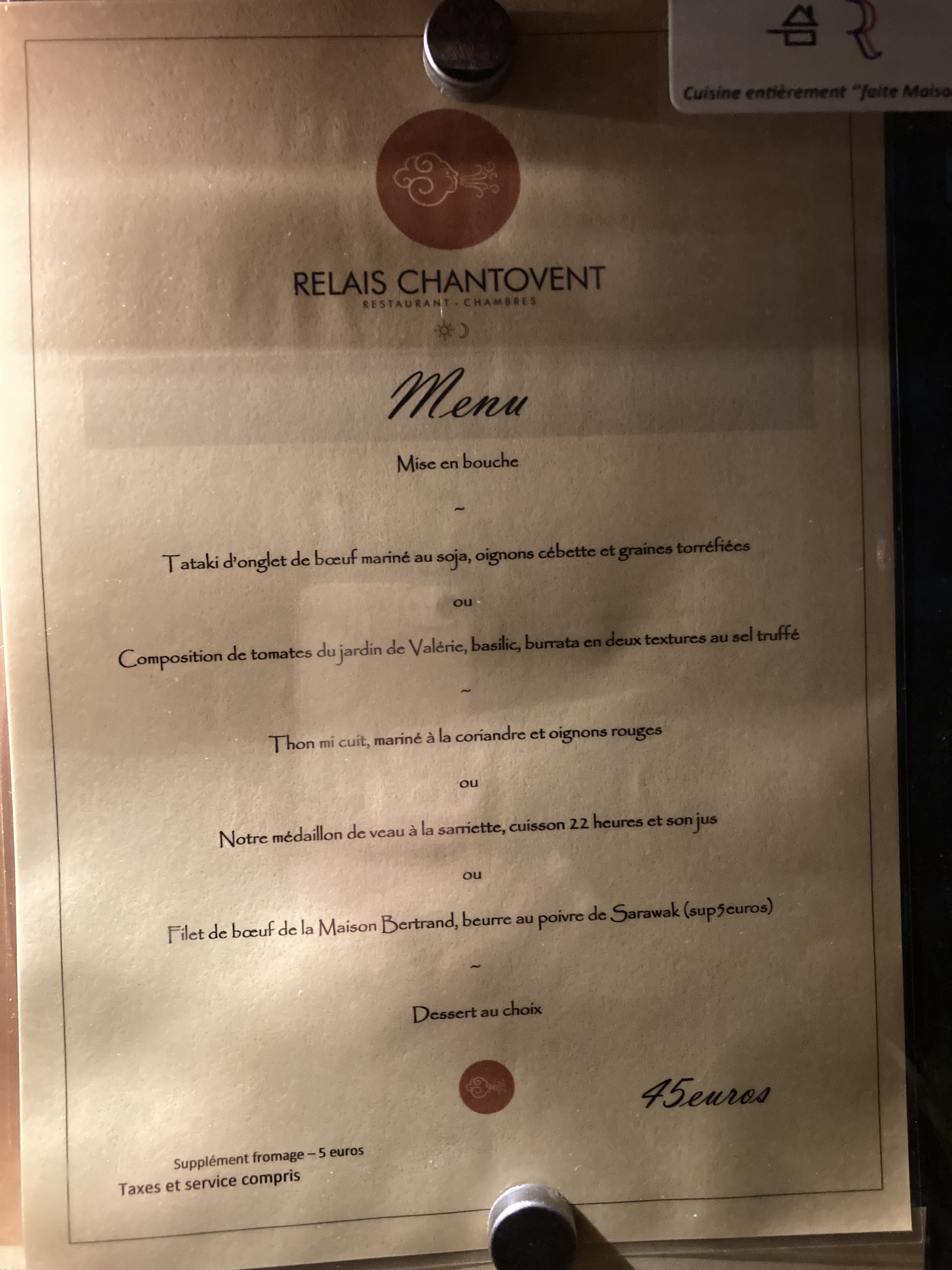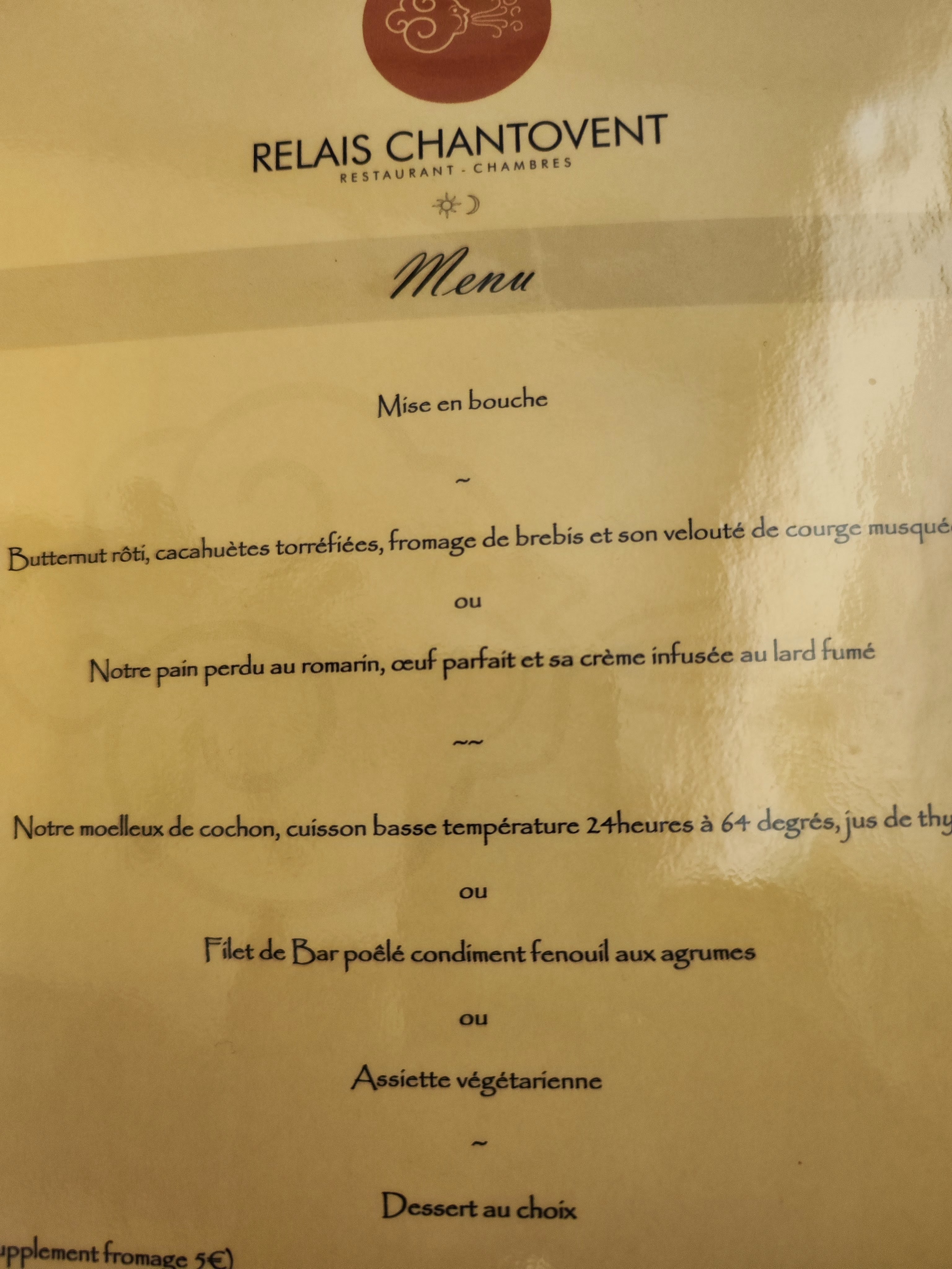 Déjeuner ce jour au relais chantovent. Initions par le négatif avant de finir sur le positif. Accueil pas très agréable de la serveuse. Pas très souriante et froide. Elle nous installe à table et me dit immédiatement « ici c’est non fumeur » car en m’installant j’avais déposé ma cigarette électronique sur la table… un peu moyen. C’est quand même agréable dans un restaurant, ou l’on paie un service de se sentir bienvenu et pas quelque peu bousculé. C’est finalement un service et un moment privilégié, quel l’on paie et où l’on veut se sentir bien, et non accueilli de façon un peu blasée comme l’on peut retrouver au service des impôts (et encore) Passons au positif car il y en a quand même beaucoup. Nous avons prix le menu à 29€ avec une petite part de focaccia et de bonnes olives locales servis en même temps que la bouteille de vin que nous avons commandé, le geste est sympathique cela n’est pas systématiquement le cas dans les restaurants et ça mérite d’être relevé. Le menu comprenait : amuse bouche, entrée, plat et fromage ou dessert au choix a la carte Chacun des plats était très fins. Le cochon cuit en 24h était excellent. La petite gelée de romarin qui accompagne le fromage était très bonne. Mention spéciale au fondant avec du chocolat Valhrona qui est une valeur sûre. Le sourire du cuisinier (patron?) qui remonte nettement la première impression de l’accueil de la serveuse. Monsieur très agréable et qui nous propose même de nous rajouter un peu de sauce de viande dans notre plat. Le pain était très très bon et maison ! Servi chaud, exquis ! Ça aussi, ça fait la différence. J’aime beaucoup quand l’amour de la cuisine va dans ces petits détails 🥰 Merci à vous et à très bientôt car nous habitons à côté :)