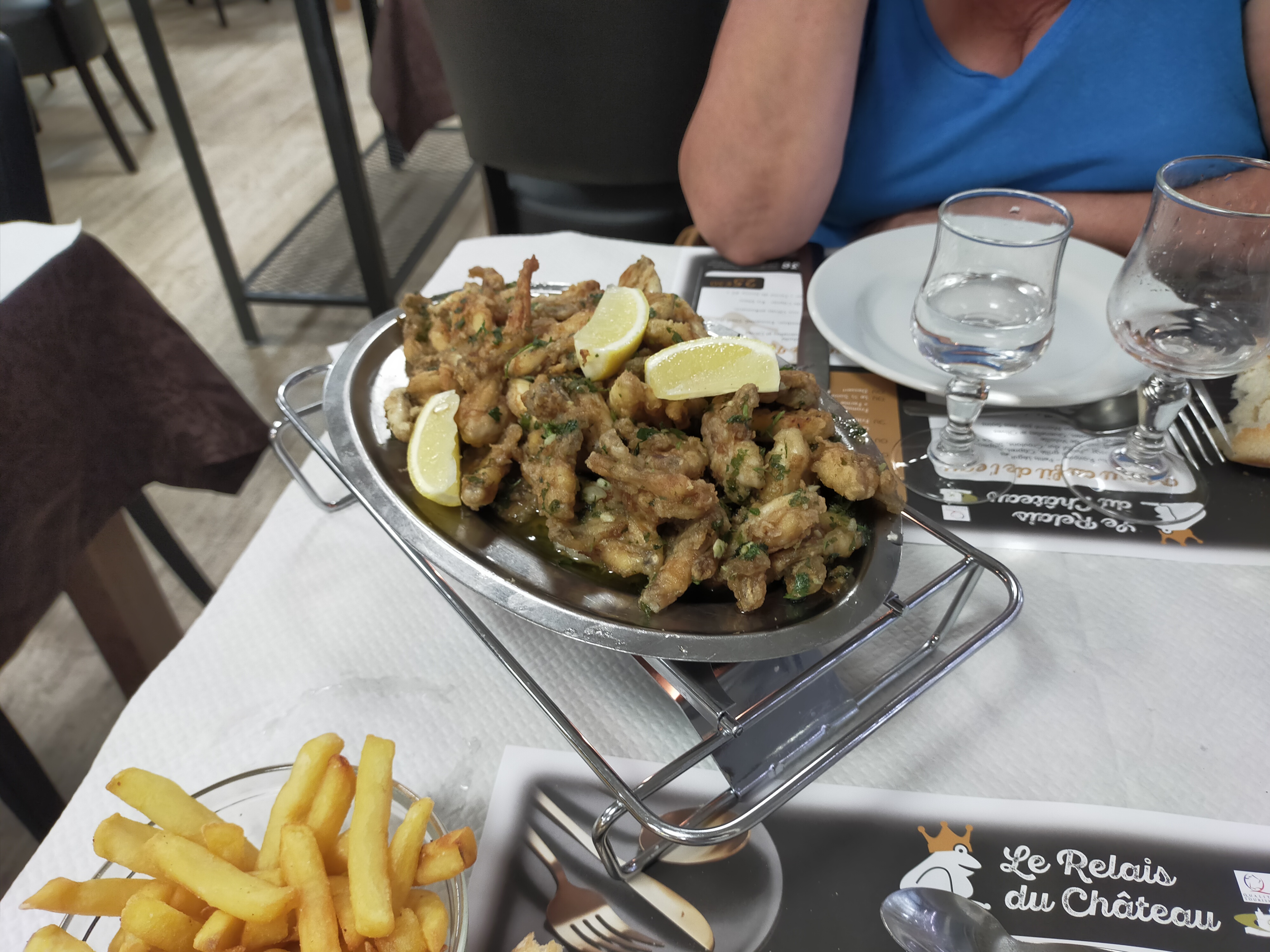 Cantine industrielle.. Les grenouilles sont non charnue, séches, cuites dans l'huile. Prix exorbitant pour la qualité. Dommage superbe cadre avec le château