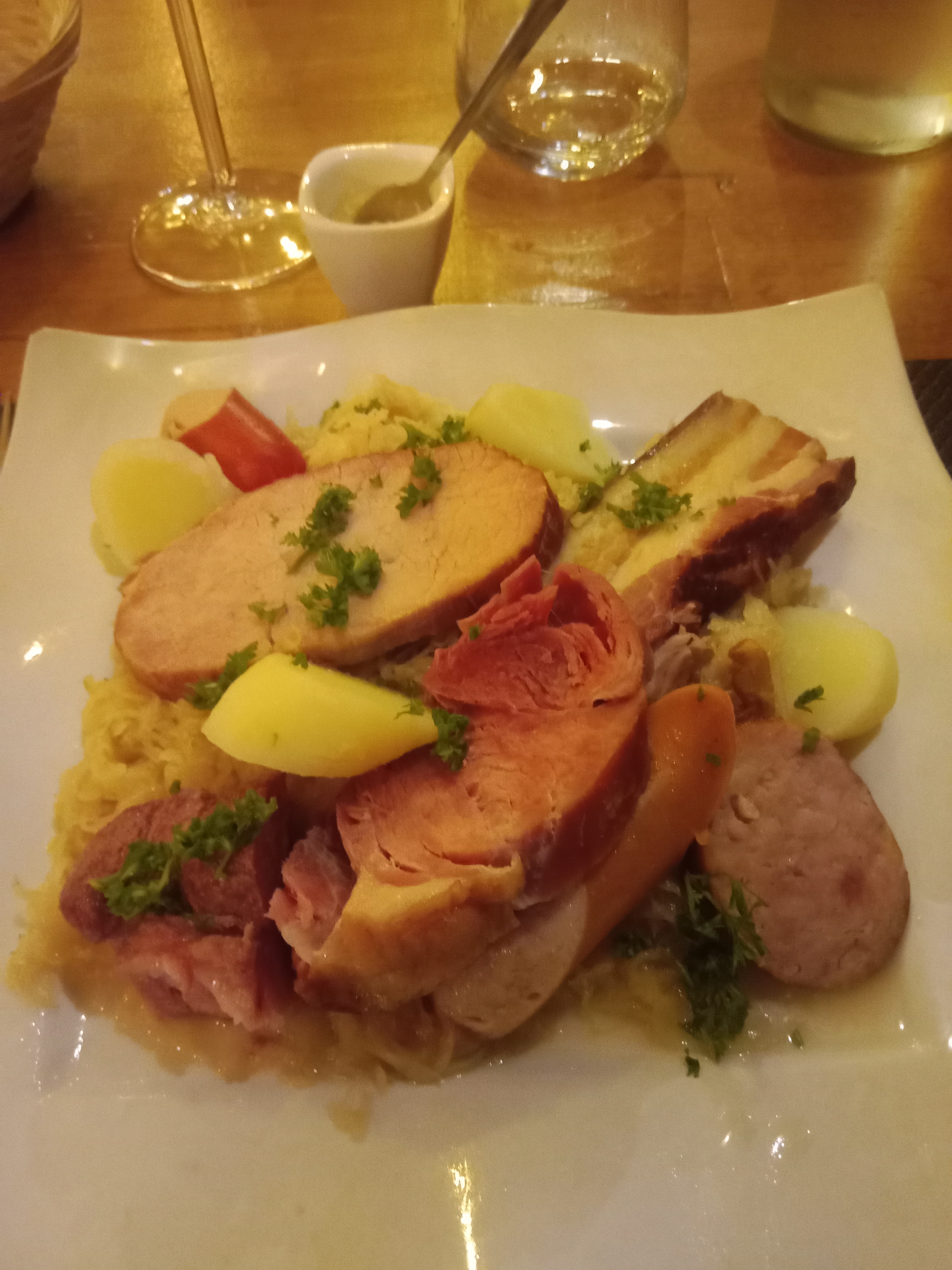 Restaurant correct, bien situé en centre ville. La chambre est normale. La carte courte et la cuisine, bien. Il a une cave souterraine avec de bons vins.