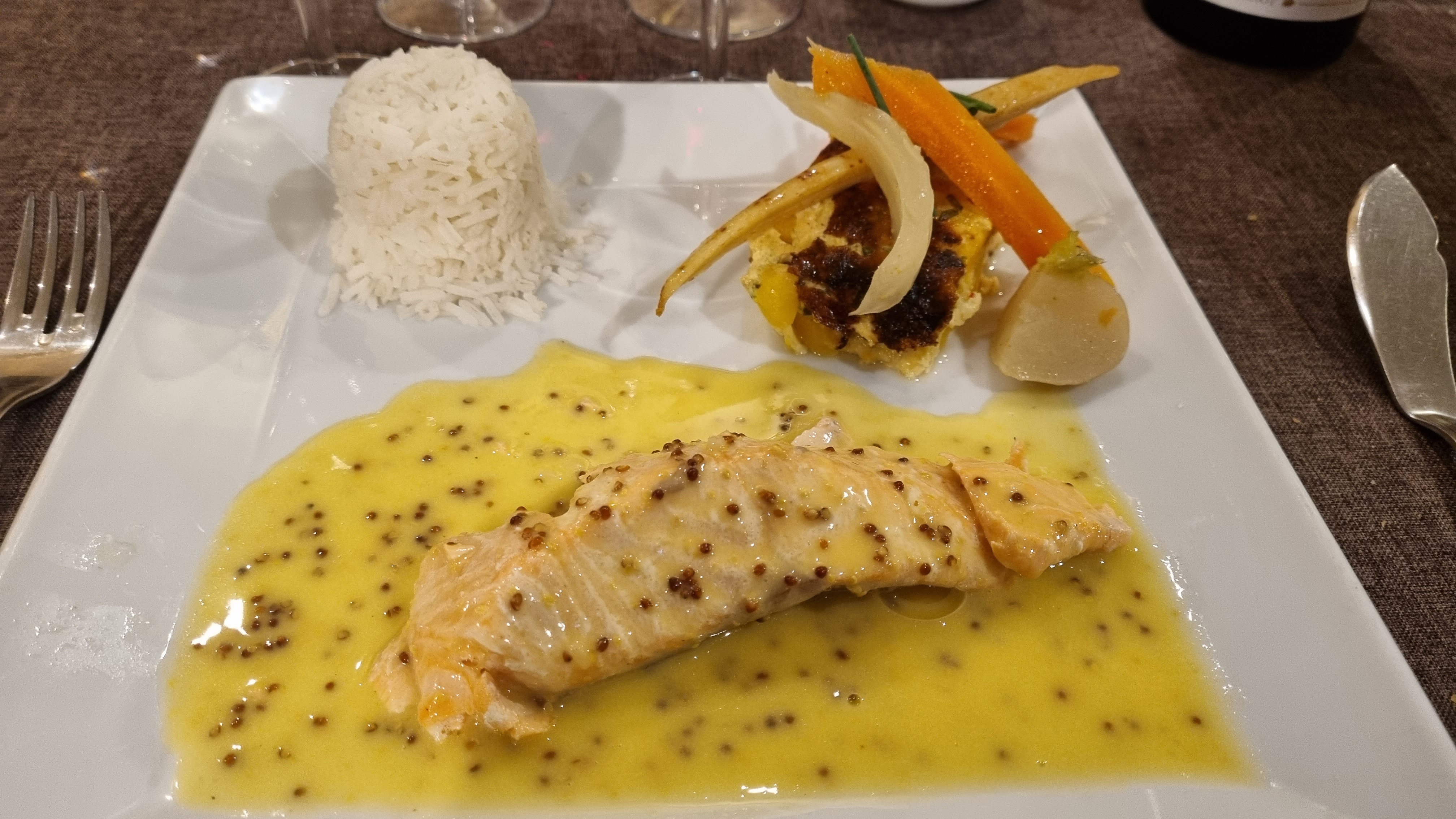 Filet de St Pierre aux épices douces accompagnement carotte ornais navet jaune carotte potiron patate douce bouillon safrané curcuma curry. Un délice