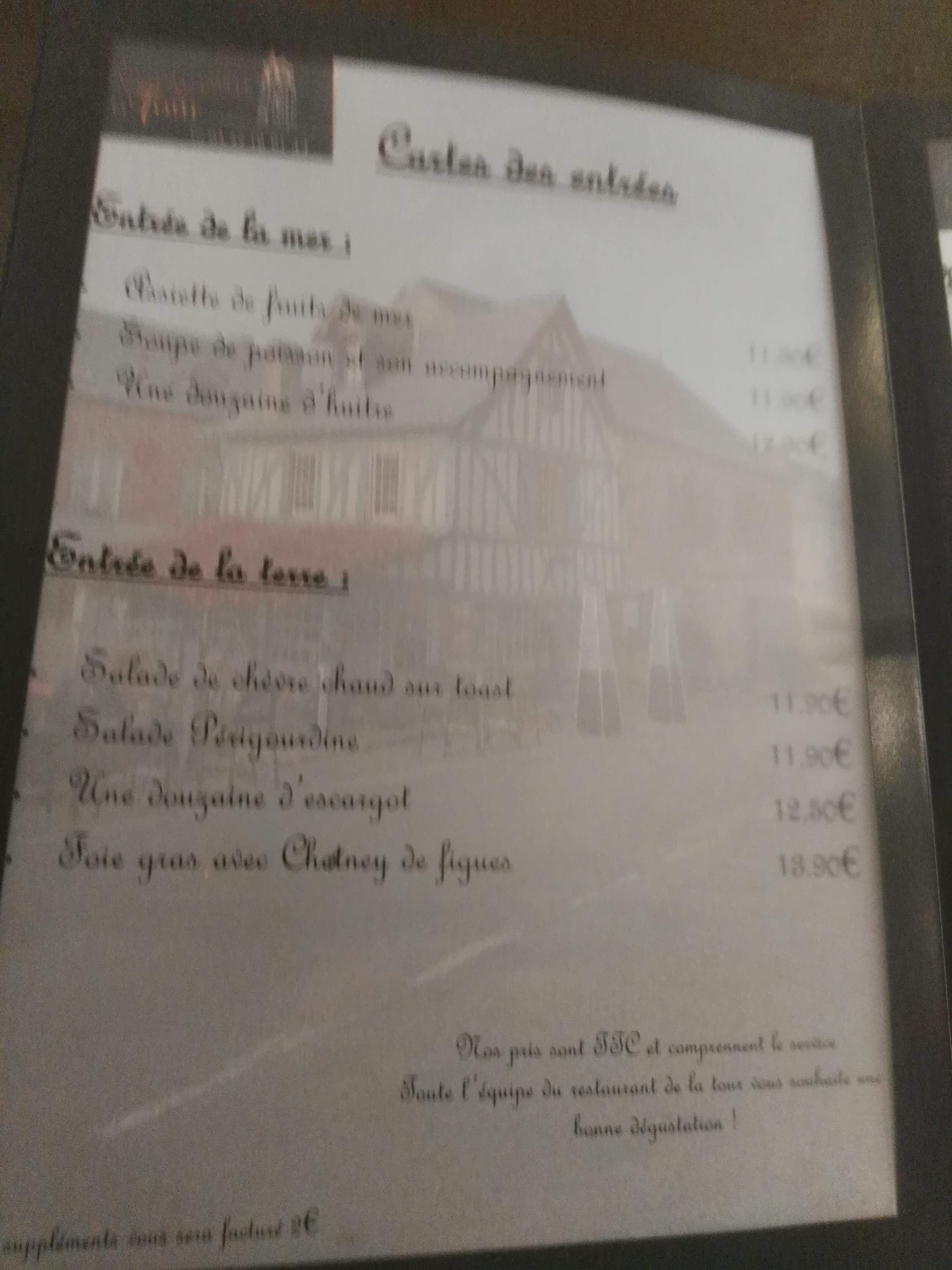 Posté le 08/06/2024 à 23:50"Très belle expérience au restaurant de la Tour situé au Bec Hellouin, un des plus beaux villages de France. Très bon accueil, service impeccable. La terrasse couverte extérieure est très agréable ; plutôt orienté cuisine traditionnelle, le restaurant propose, entre autres, du foie gras, magret de canard, Saint-Jacques sur lit de poireaux, saumon fumé maison, salade de gésiers, entrecôte et desserts faits maison. Comptez en moyenne 40€ par personne."