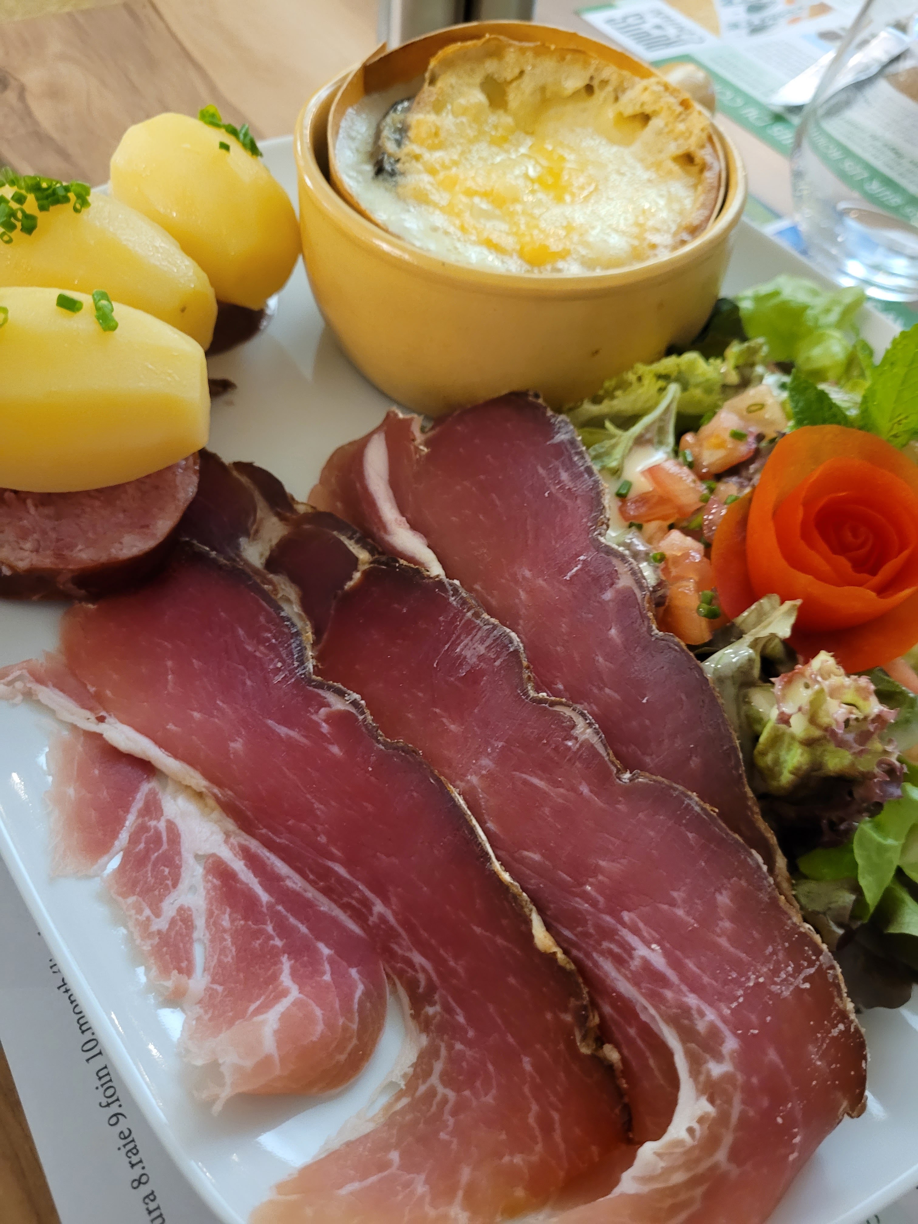 Cuisine savoureuse et raffiner, j’ai pris un filet de truite fumée avec gratin dauphinois , ( tout est fait maison , ce qui devient rare ) la dame de salle était très serviable et souriante !