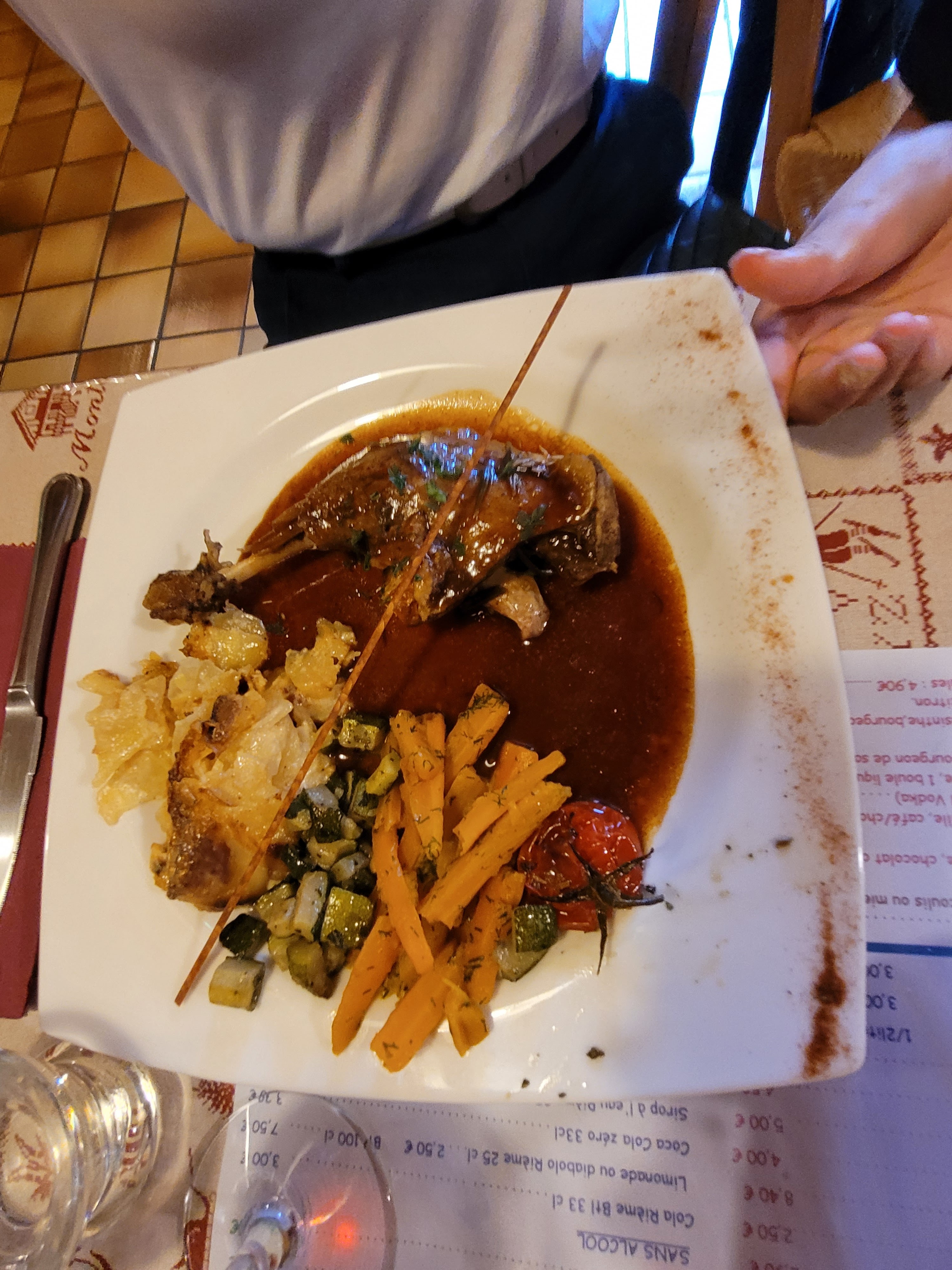 Posté le 17/08/2024 à 20:53"De passage, sans avoir réservé pour déjeuner, nous avons été très bien reçus par une patronne souriante. Les plats étaient succulents. Jambonneau confit au miel et thym pour moi, poisson pour mon mari, le tout accompagné de légumes. Ouf, ce n'était pas des frites !!! Très bonne crème brûlée en dessert."