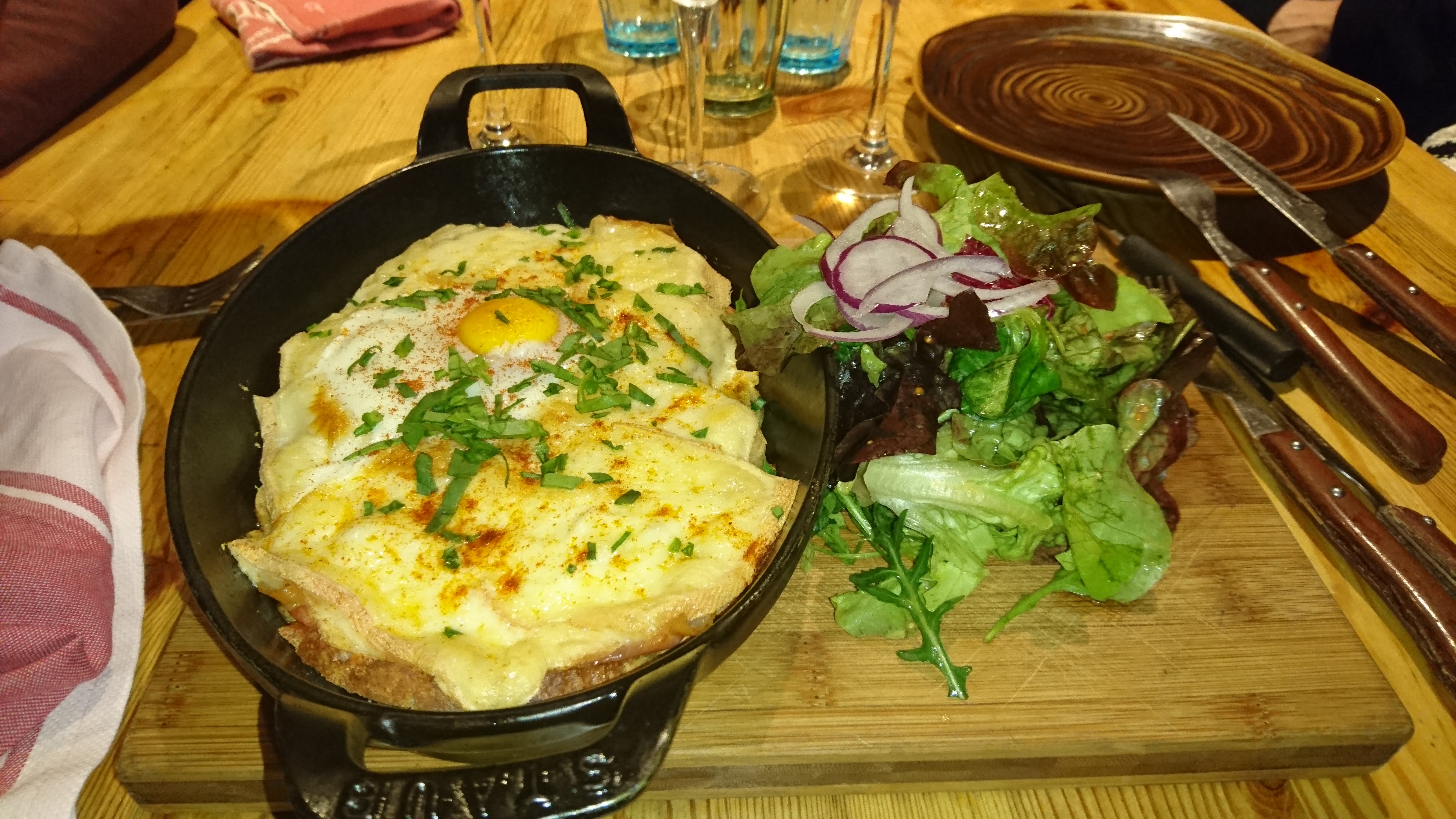 Posté le 30/08/2020 à 07:28"Un très bon dîner en terrasse avec une belle croûte briançonnaise,du pain de mie imbibé de vin blanc,jambon blanc,oeuf et raclette le tout gratiné servie avec une salade verte. J'ai eu du mal à la finir! Avec un bon verre de Chianti magnifique! Bonus une sympathique ambiance musicale donné par un duo de musiciens!"