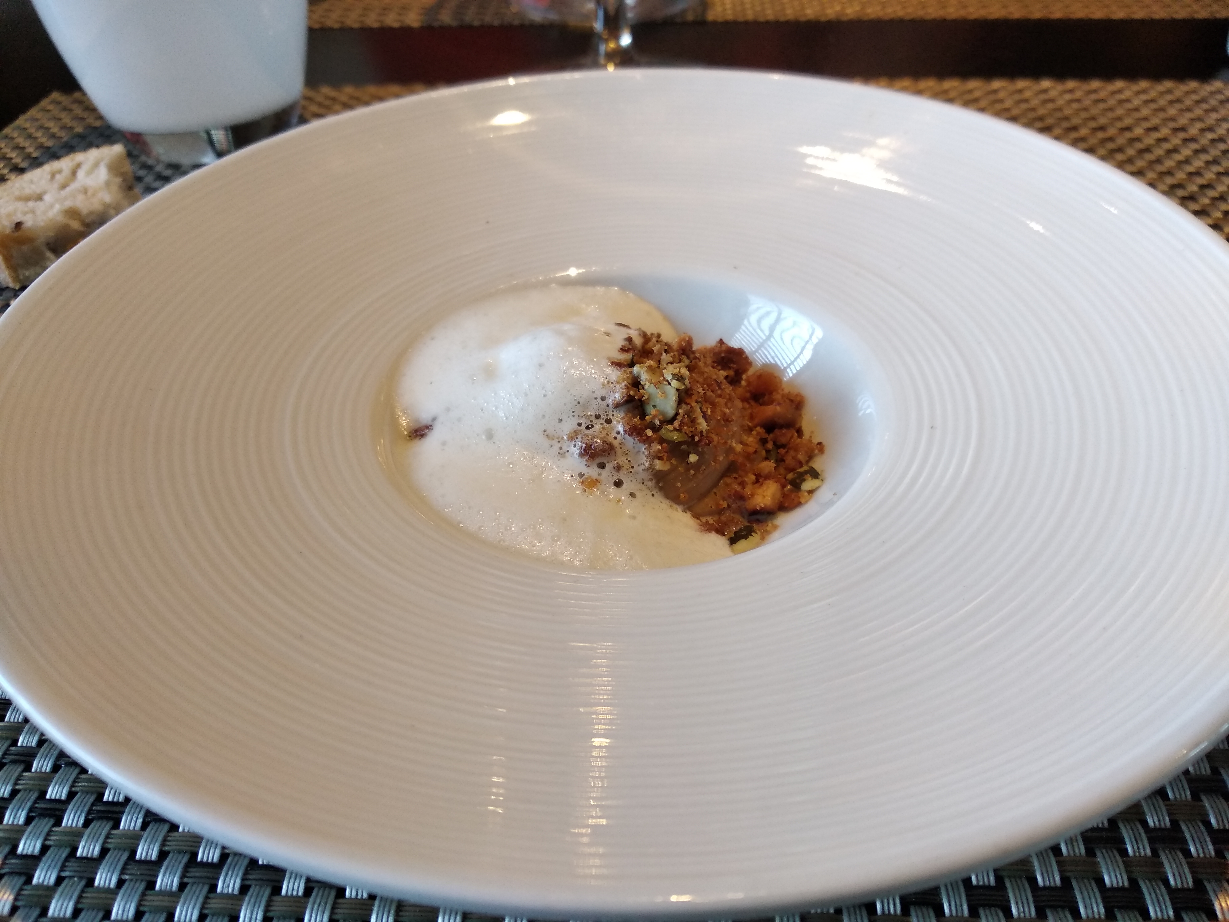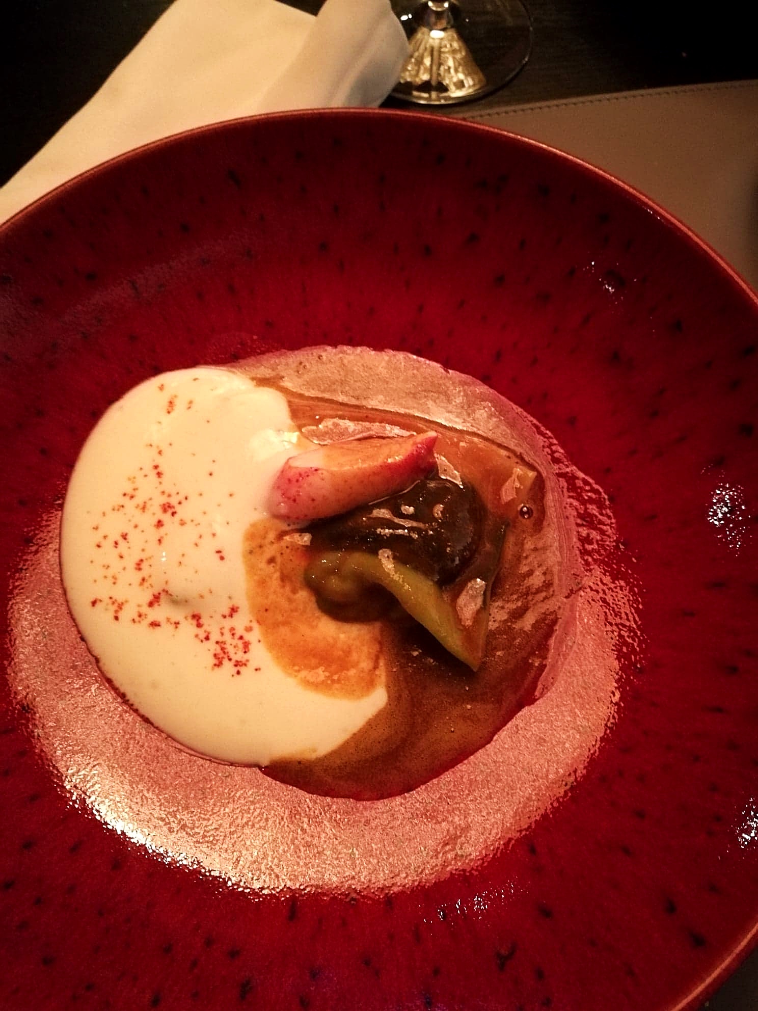 Le menu surprise en 4 plats un régal ... après les amuses bouches délicats (une rillettes aux maquereaux à la moutarde top) une pré entrée aux courgettes... fine des photos plutôt qu'un long discours ! Dorade curry fenouil, raviole de homard (culte), entrecôte et son aubergine en 2 saveurs, pré dessert avec un baba... baba et pour finir une petite balle de chocolat blanc enrichie... et à l'huile d'olive ! Une très belle soirée....