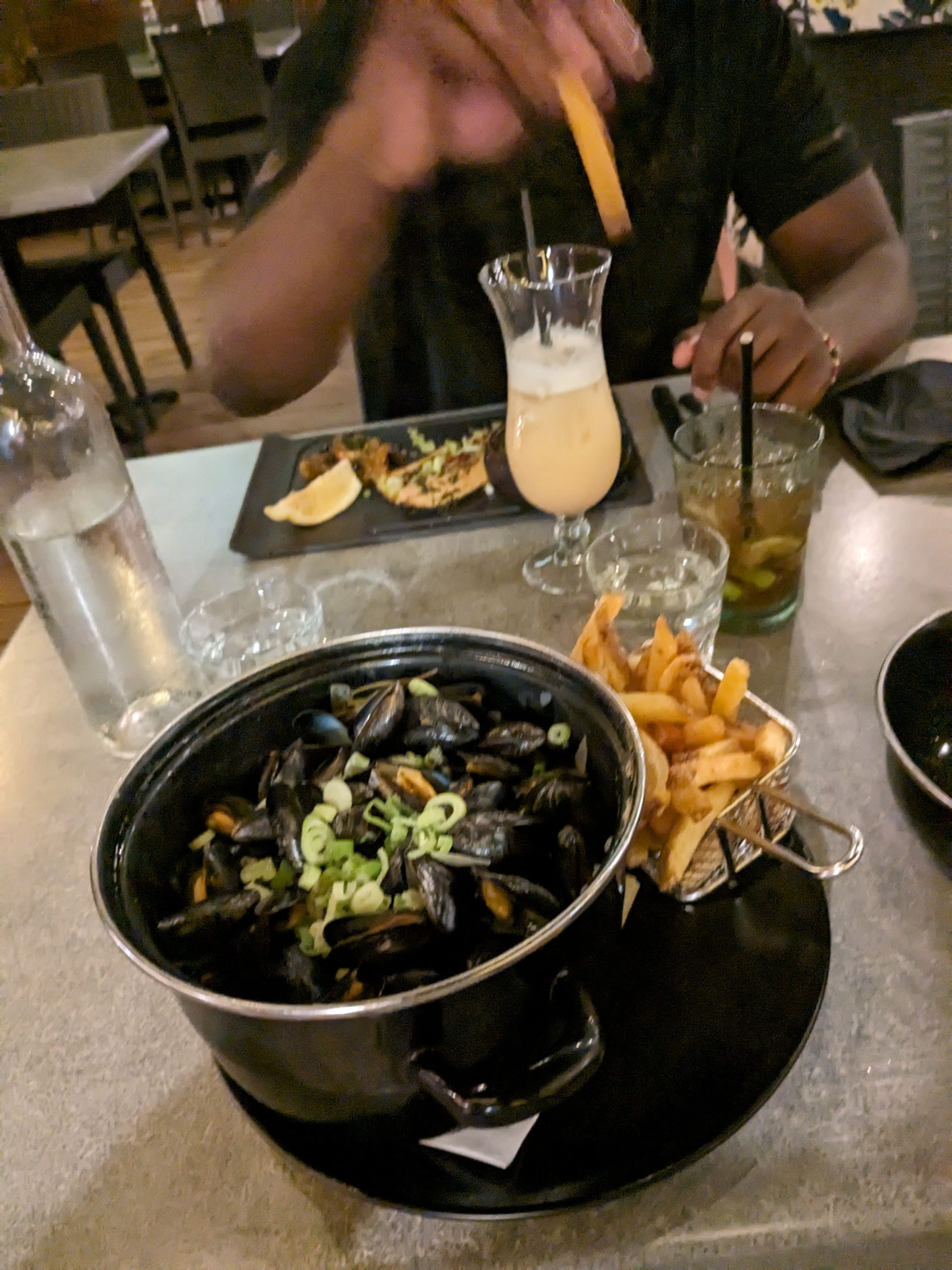 Serveur très sympa, avenant, a nos petits soins, vraiment quelqu'un de très agréable.(théo je crois) Niveau plat plutôt déçu, j'ai pris moule frites. Les moules étaient très petite. Frites bonnes. En dessert j'ai pris une dame blanche qui était bonne. Restaurant propre, très grande terrasse avec son parking privé. Table à langer dans les toilettes femmes