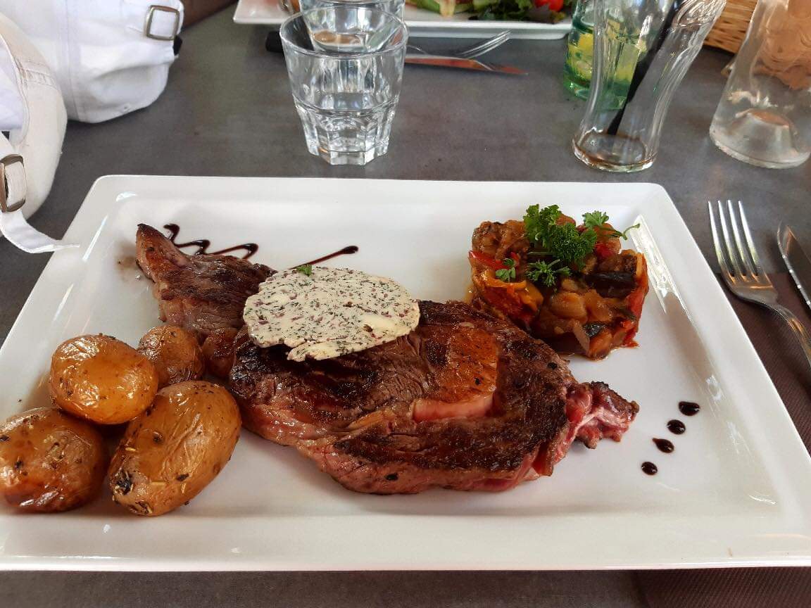 Très bon accueil et service impeccable Nous avons opté pour une entrecôte et des cuisses de grenouilles avec bière + coca Un excellent déjeuner sur la terrasse ombragée Un service parfait pour des plats très réussis tant gustativement que visuellement Une très bonne adresse à visiter régulièrement Qualité prix raisonnable Merci pour ce retour au vrai restaurant...