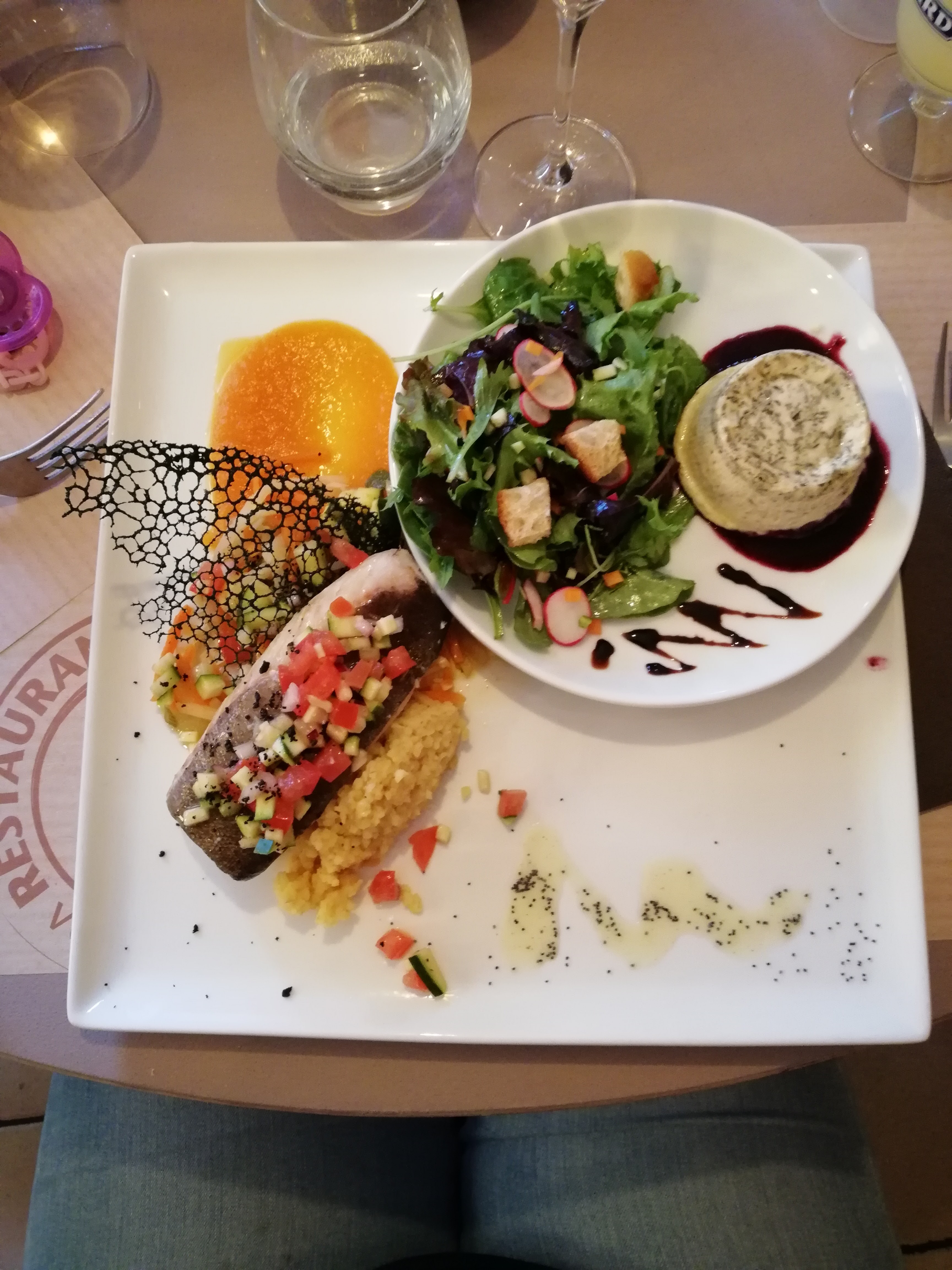 Restaurant choisi car bien noté et on comprend pourquoi^^. Bon accueil du personnel qui est sympathique. Service rapide et agréable. Plats très bons, beaux et originaux. Agreable d avoir unp petite mise en bouche avec l apero très bonne. Très bon rapport qualité prix. Je recommande ce restaurant !^^