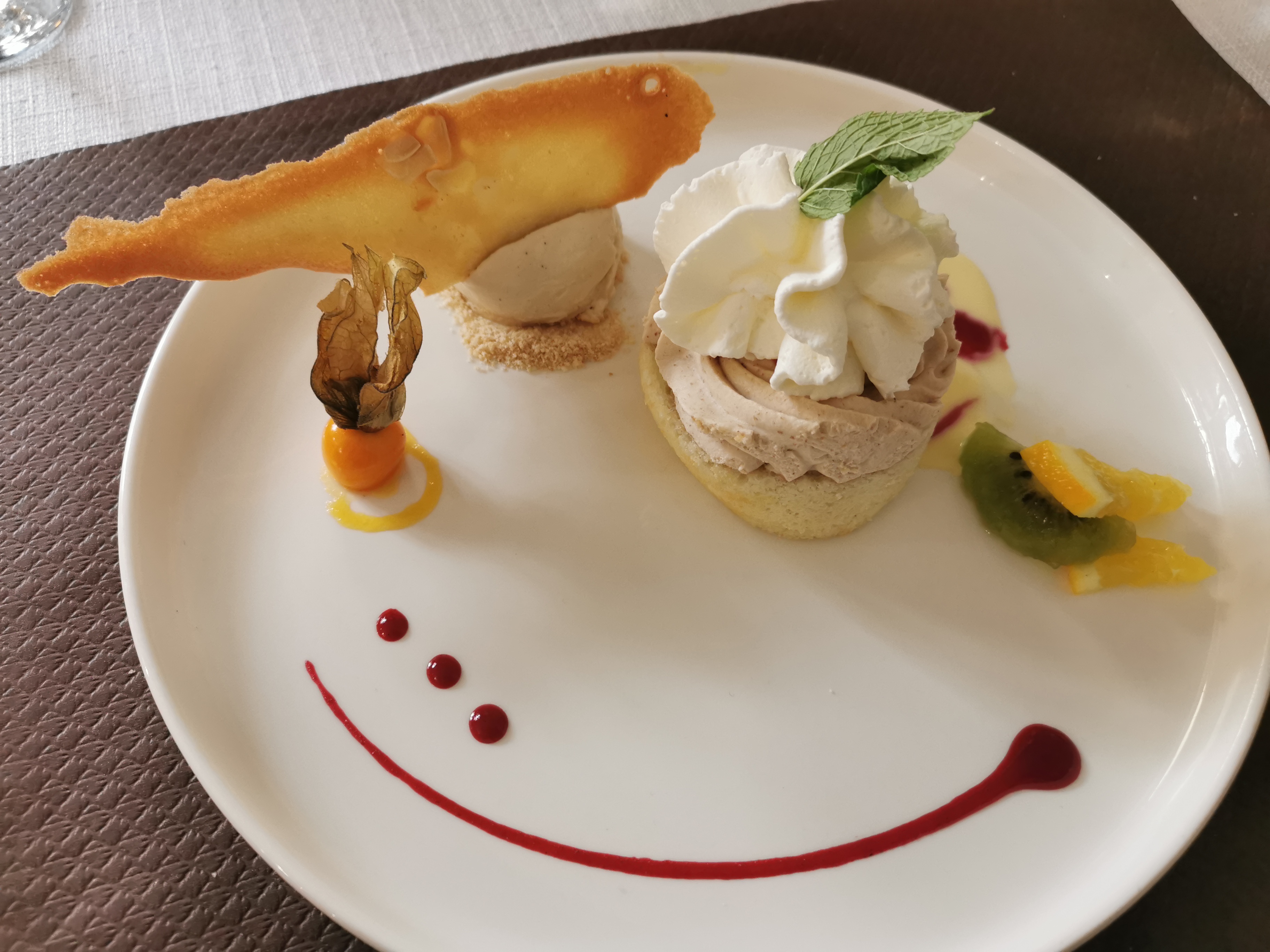 Cadre parfait. Personnel agréable et compétent. Repas à l'occasion de notre anniversaire de mariage, vraiment nous n'avons pas été déçu. La salade avec foie gras et magret , un régal. La côte de veau sauce cèpe pomme de terre rôtis, sublime.. quant au dessert, pour mon mari : île flottante, un délice.. pour moi gâteau pomme noix, bémol manque un peu de noix... dommage. Mais cet établissement est à recommander. PARFAIT SUBLIME GENIAL Merci.