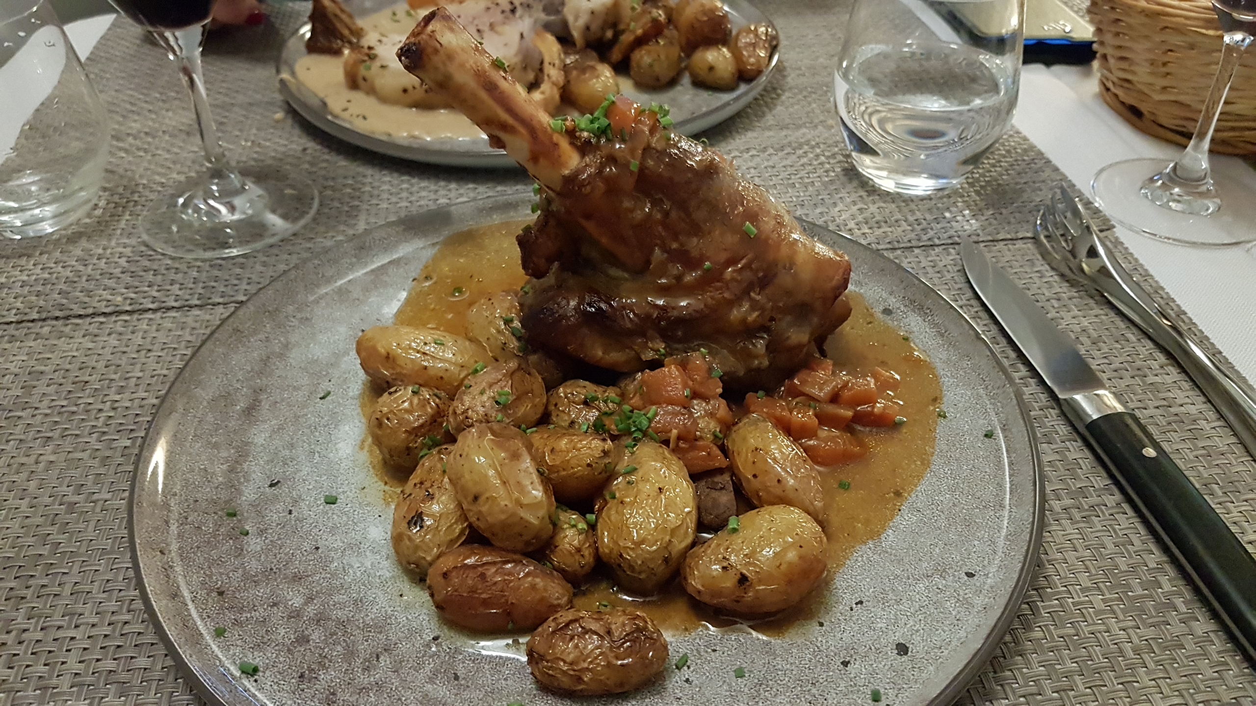 Cuisine gastro sympa j ai pris personnellement du foie gras en entrée qui était très bon et copieux avec du pain aux noix délicieux et en plat principal j ai pris une côte de boeuf assez copieuse que j ai un peu moins bien aimé perso au niveau du goût mais tout a fait correct. Pas de place pour mon estomac pour un dessert. En résumé, bonne adresse avec un patron sympa et attentif , faut venir avec un solide appétit !
