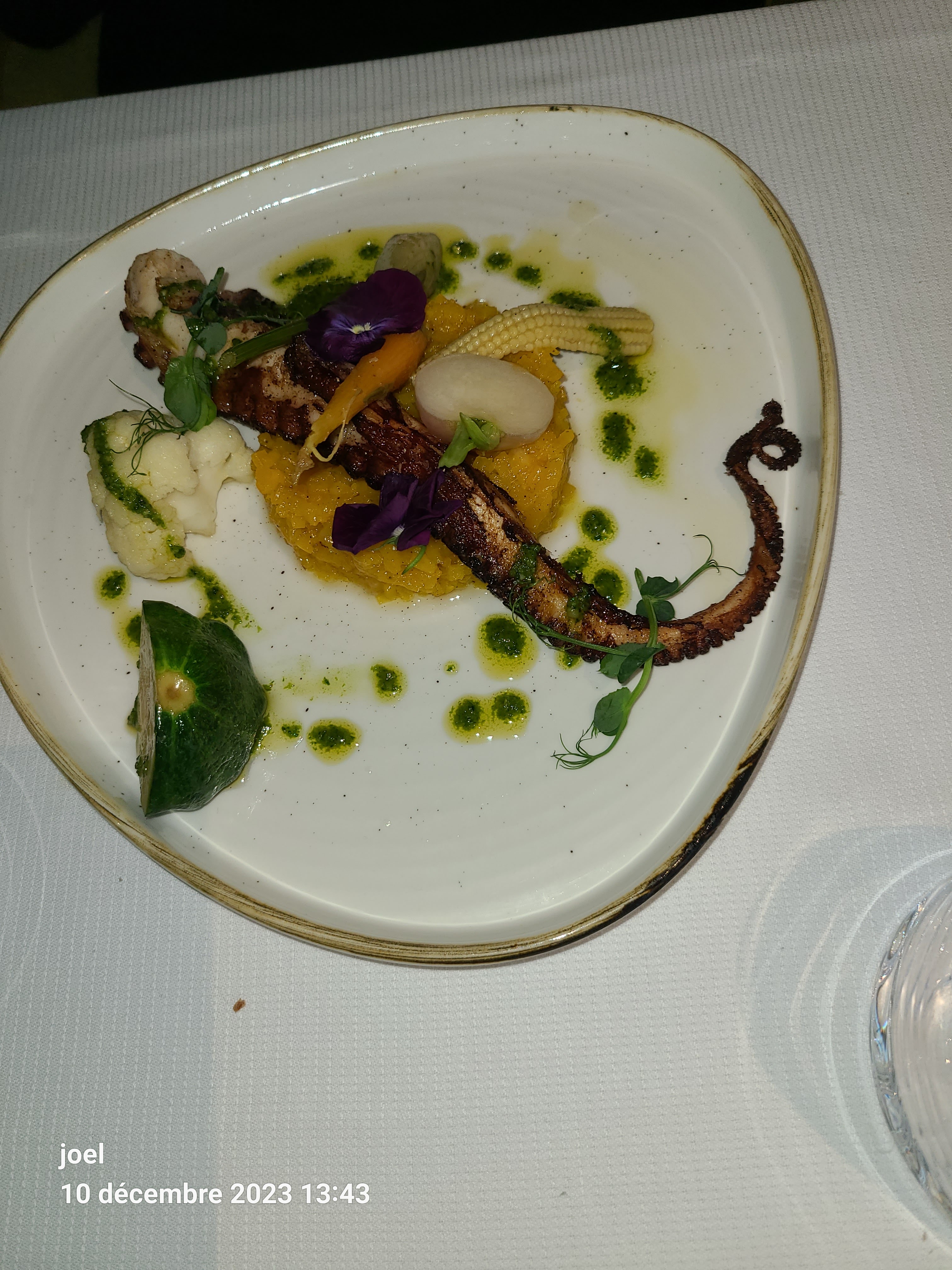 Tout était super. Religieuse aux champignons et marrons très bonne (quoique froide, dommage), heureux mariage de saveurs avec le filet de boeuf et son pain d'épice, le dessert succulent ainsi que le vin au verre conseillé. De plus le personnel est très agréable et souriant. Bonne continuation!