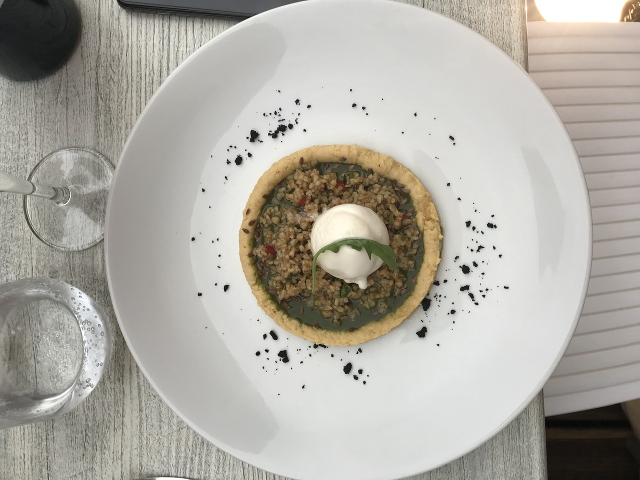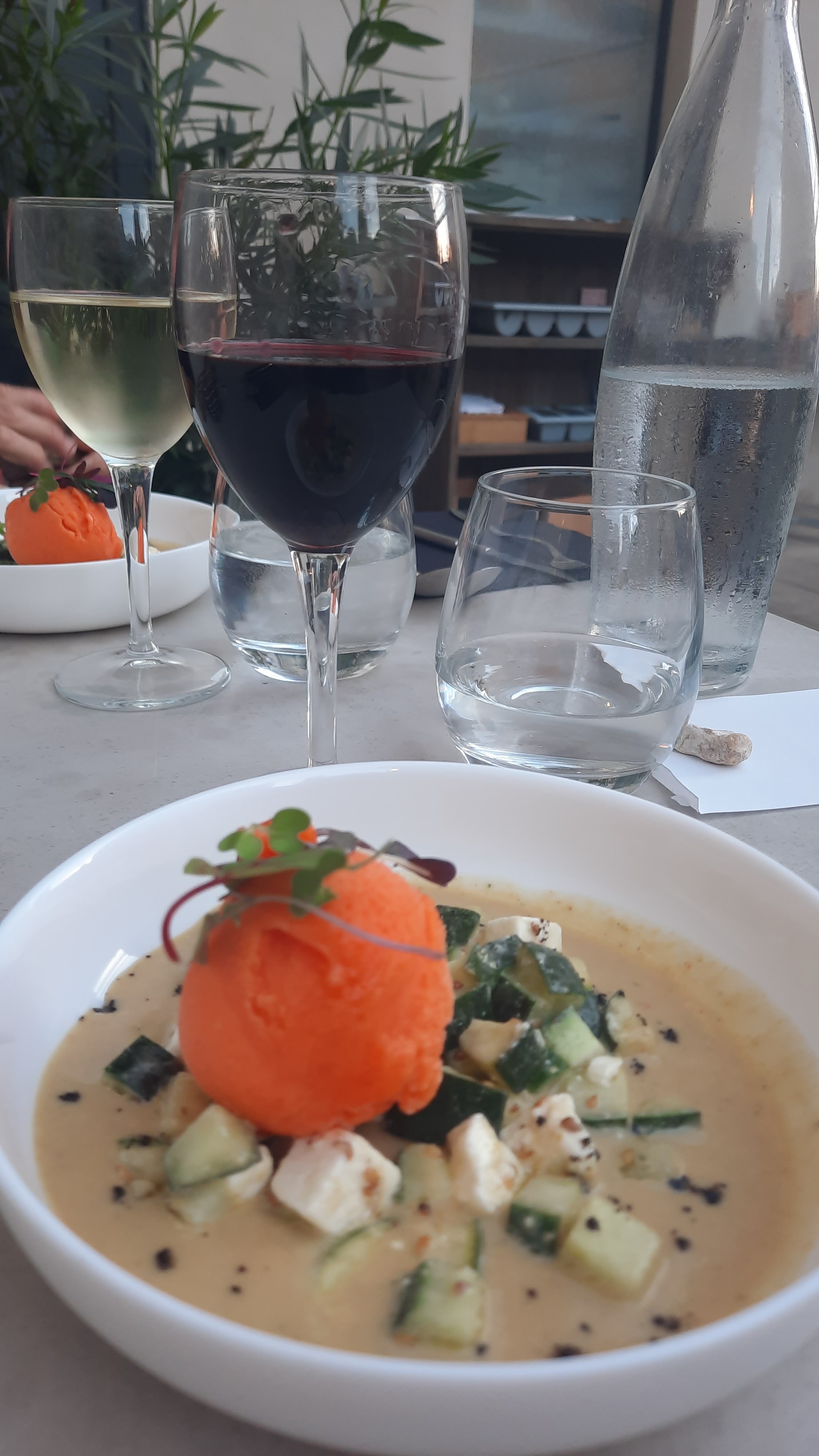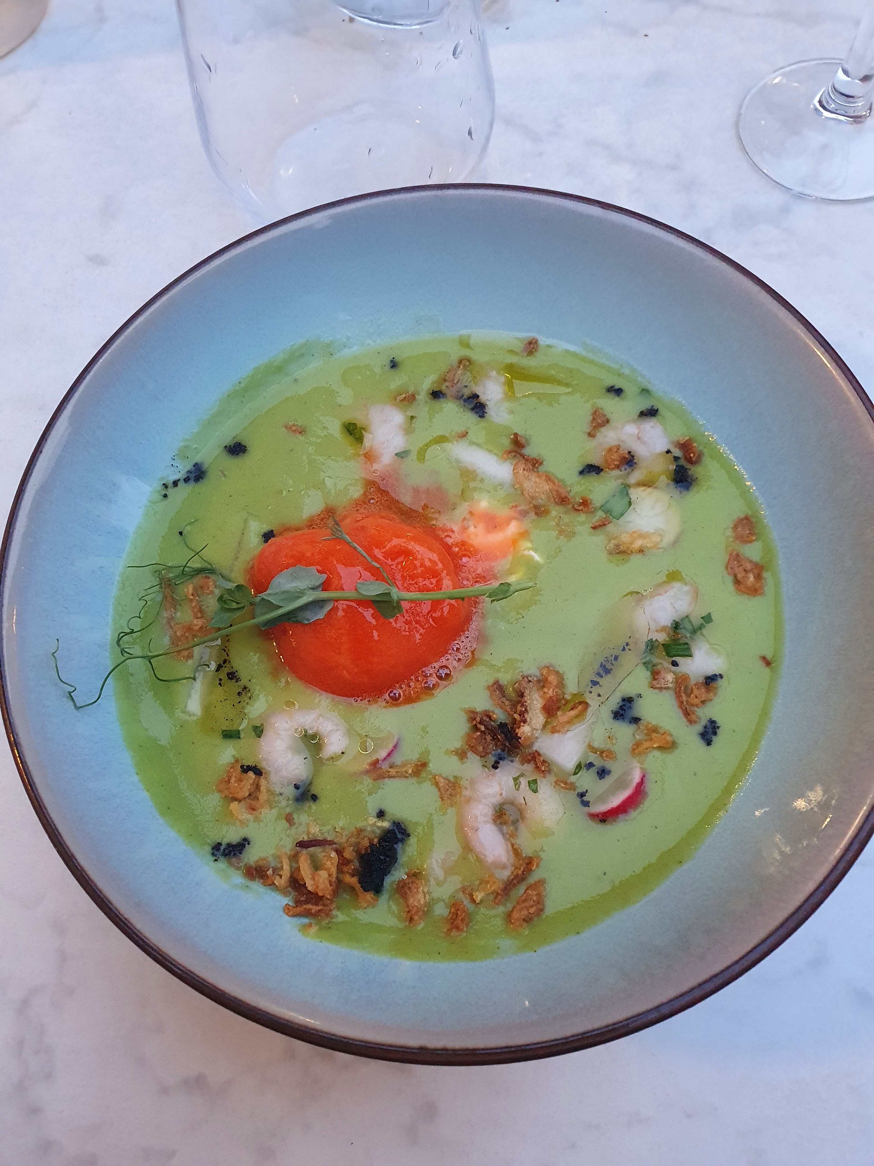 Un régal ! Oui, le cadre est très agréable. Le personnel est patient 😅 et sympathique. Ils ont une belle cuisine. Mon entrée était fraîche et savoureuse. (Pois chiche et sorbet poivrons) La pizza divine ! (Plusieurs fromages) Le dessert parfait pour un fin de repas. A ne pas manquer