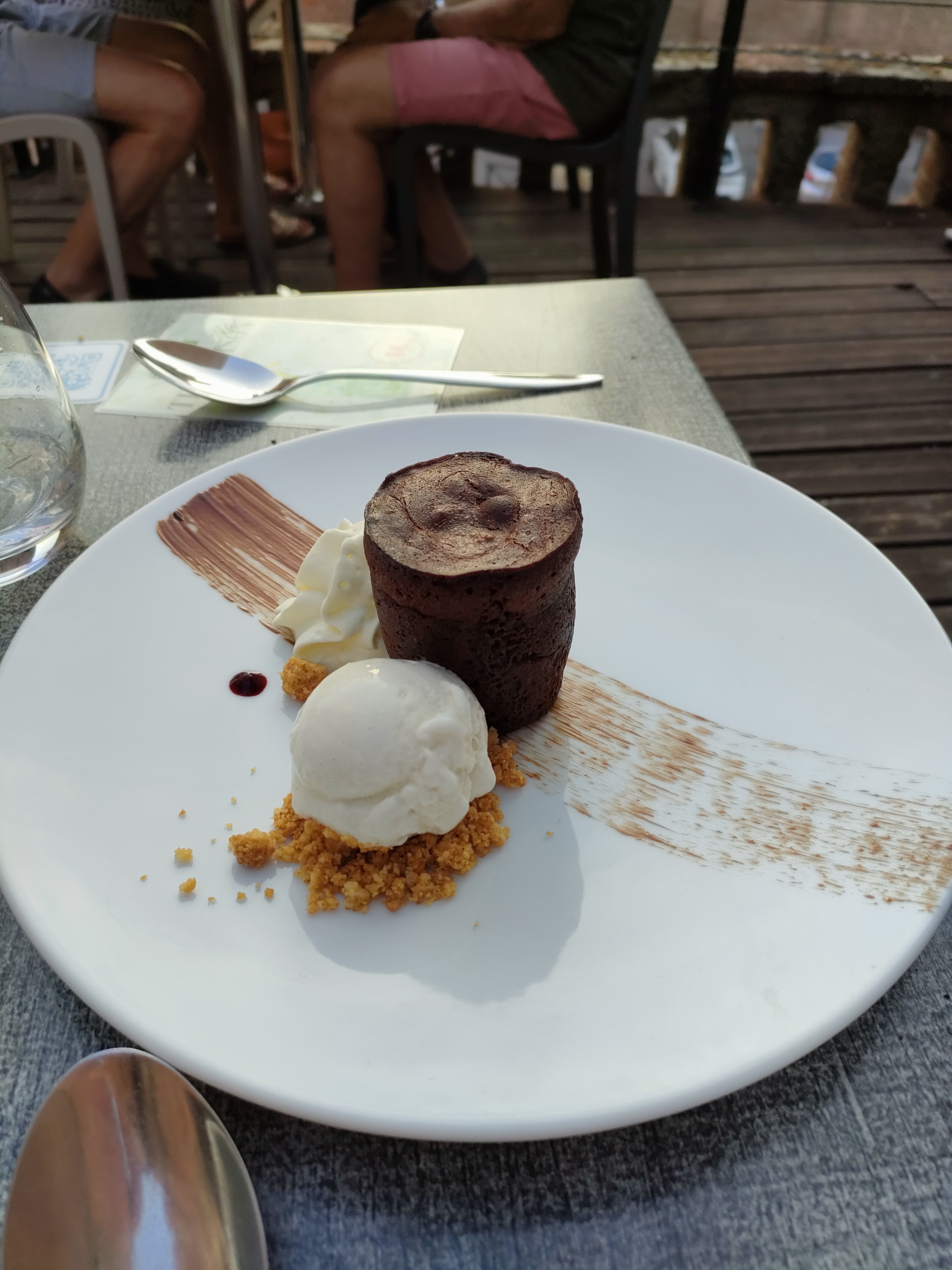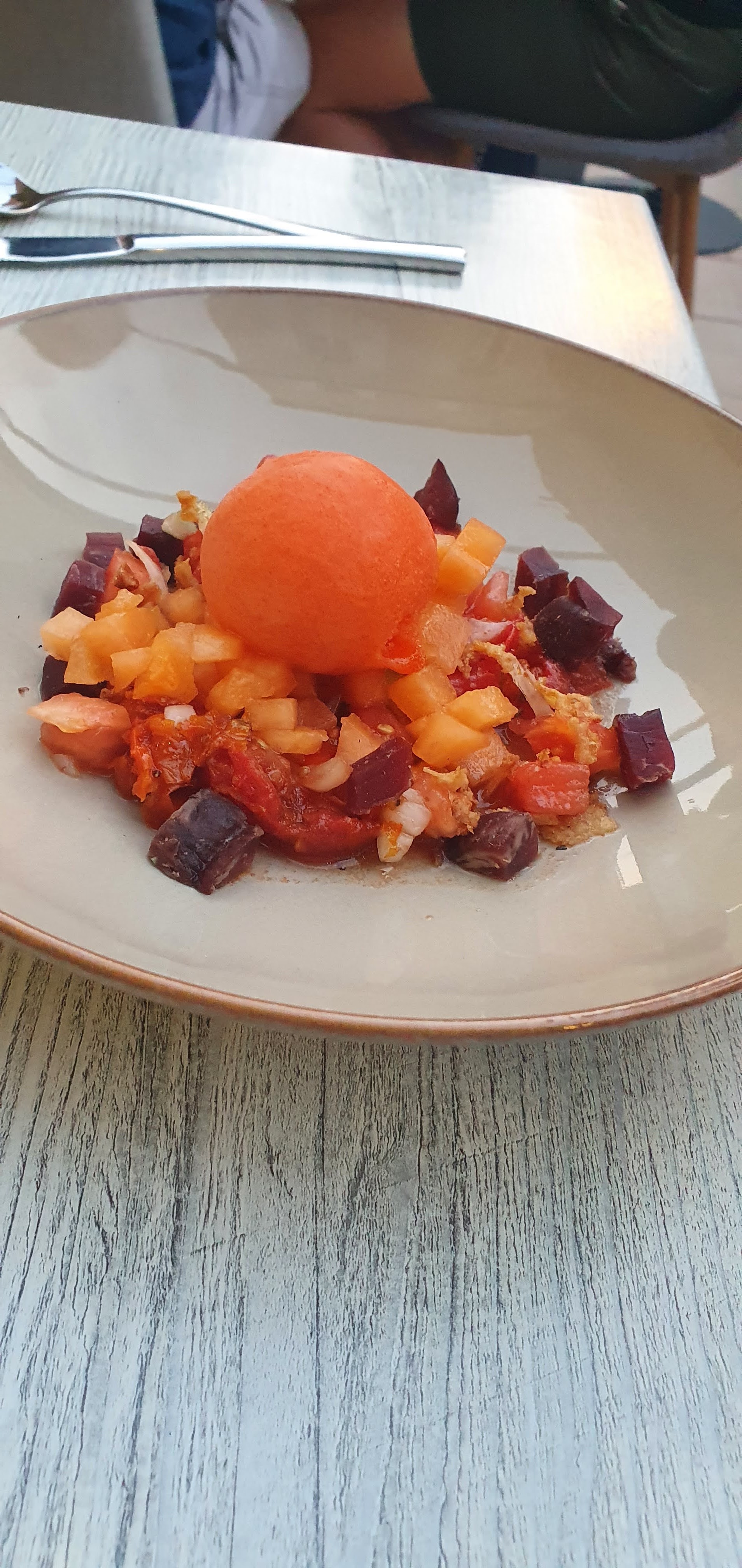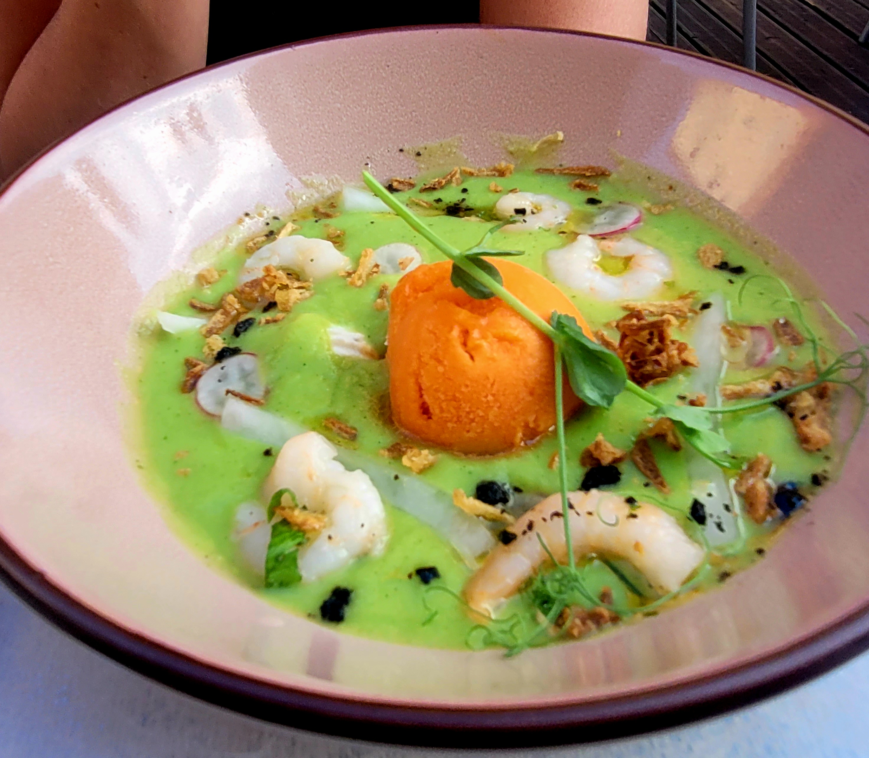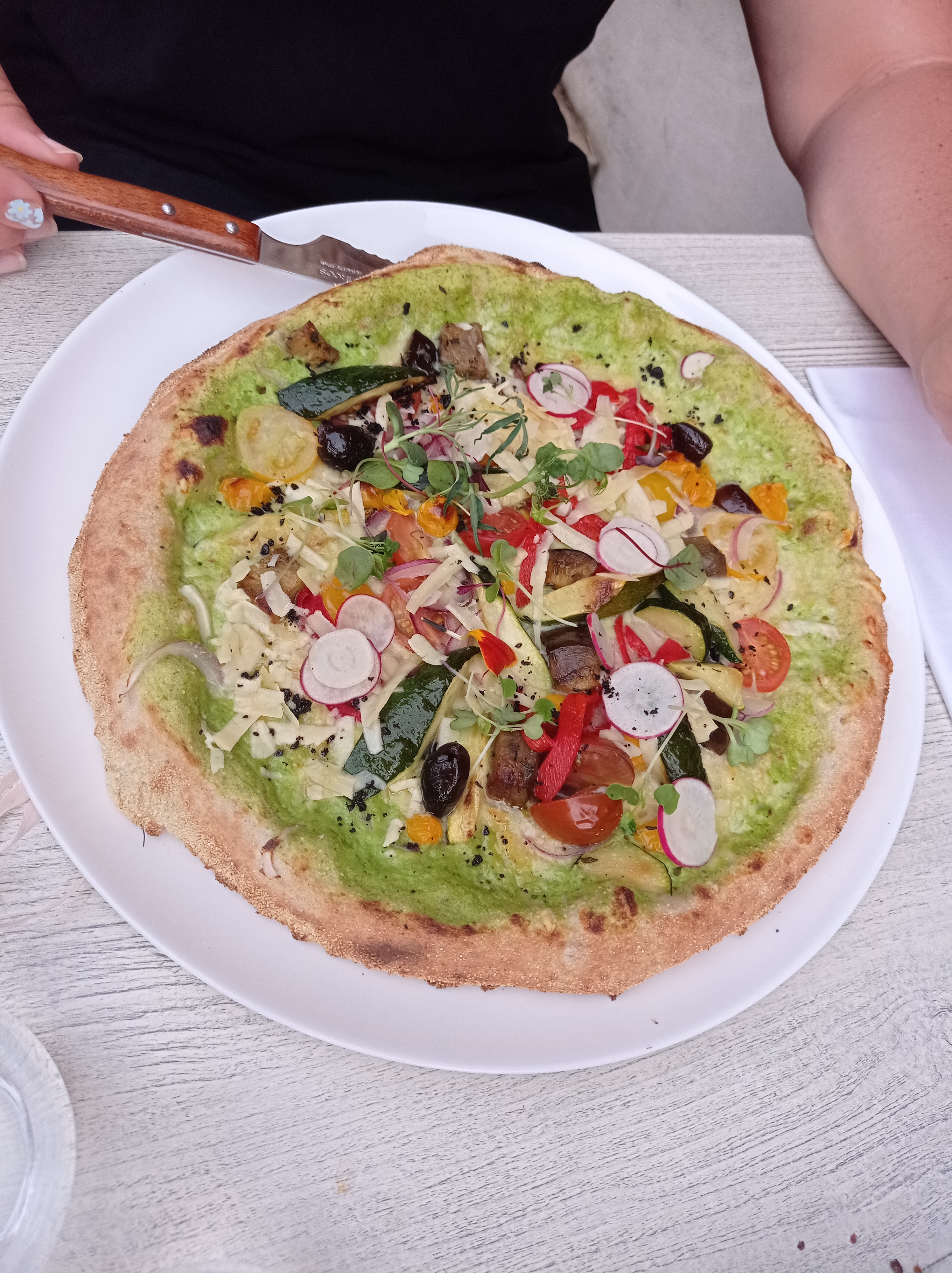 Un régal ! Oui, le cadre est très agréable. Le personnel est patient 😅 et sympathique. Ils ont une belle cuisine. Mon entrée était fraîche et savoureuse. (Pois chiche et sorbet poivrons) La pizza divine ! (Plusieurs fromages) Le dessert parfait pour un fin de repas. A ne pas manquer
