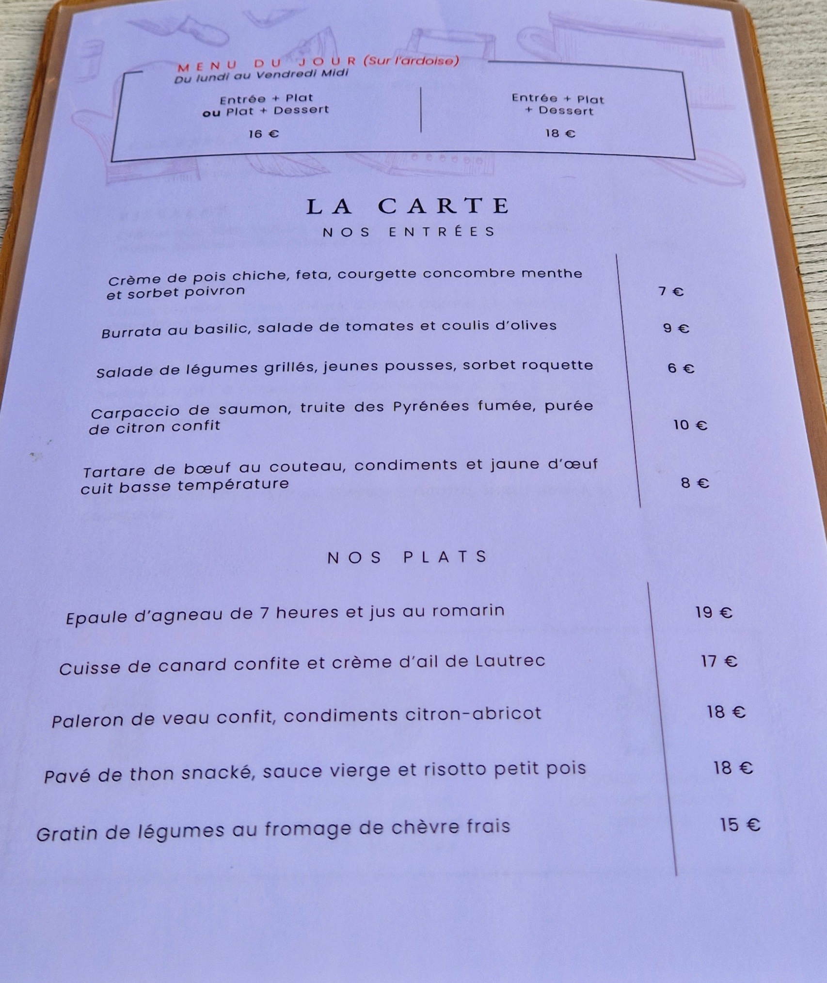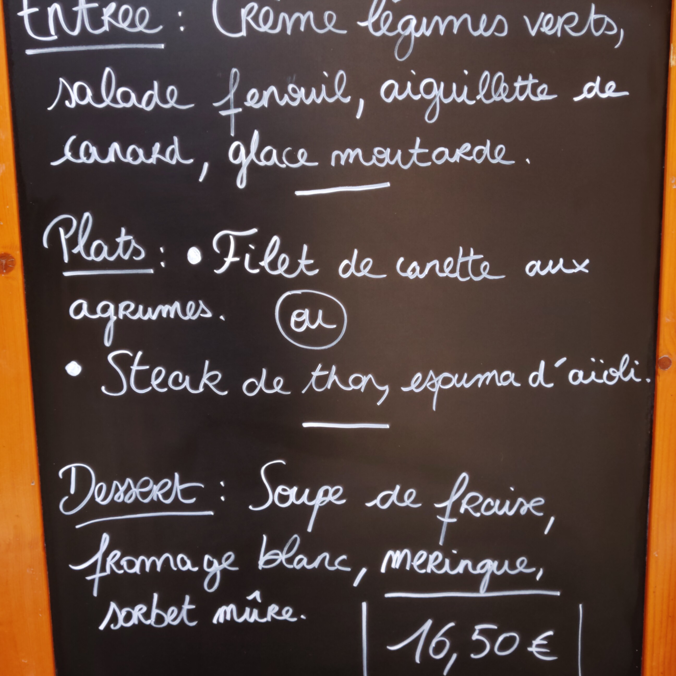 Bonne surprise pour le rapport qualité prix !!! 1 seul menu du jour (poisson ou viande) pas besoin d’hésiter c’est parfait. La cuisson était parfaite, bon goût raffiné. On s’est régalés, merci beaucoup !