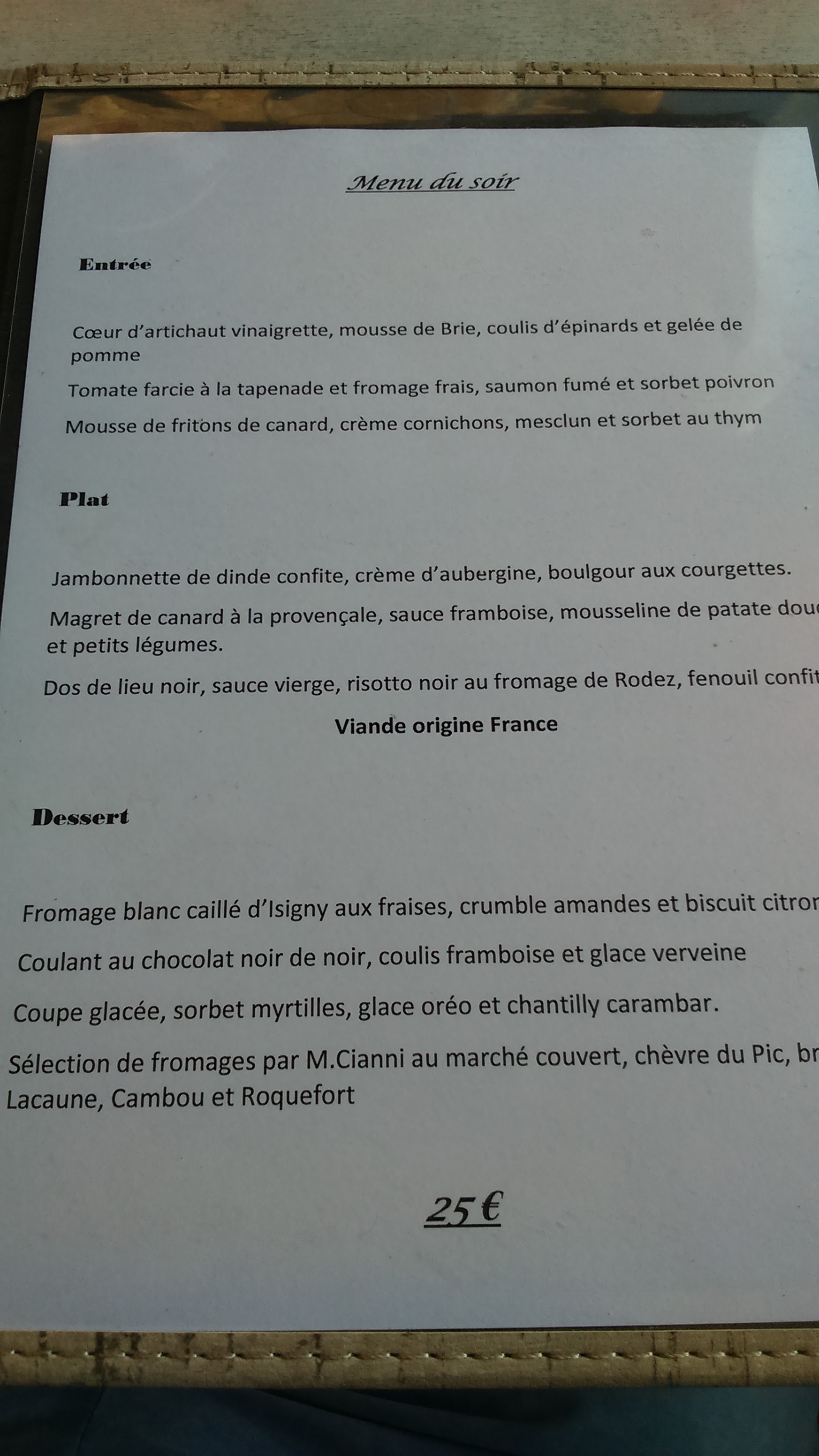 Le cadre est superbe. Chic mais tout à la fois convivial. Menu unique à 25 euros. 3 entrées 3 plats 3 desserts. Ce fût très bon. Rien à redire sur la qualité des plats. Le seul petit bémol le service. Un peu long mais rien de bien méchant. Un bel endroit. Je recommande fortement.