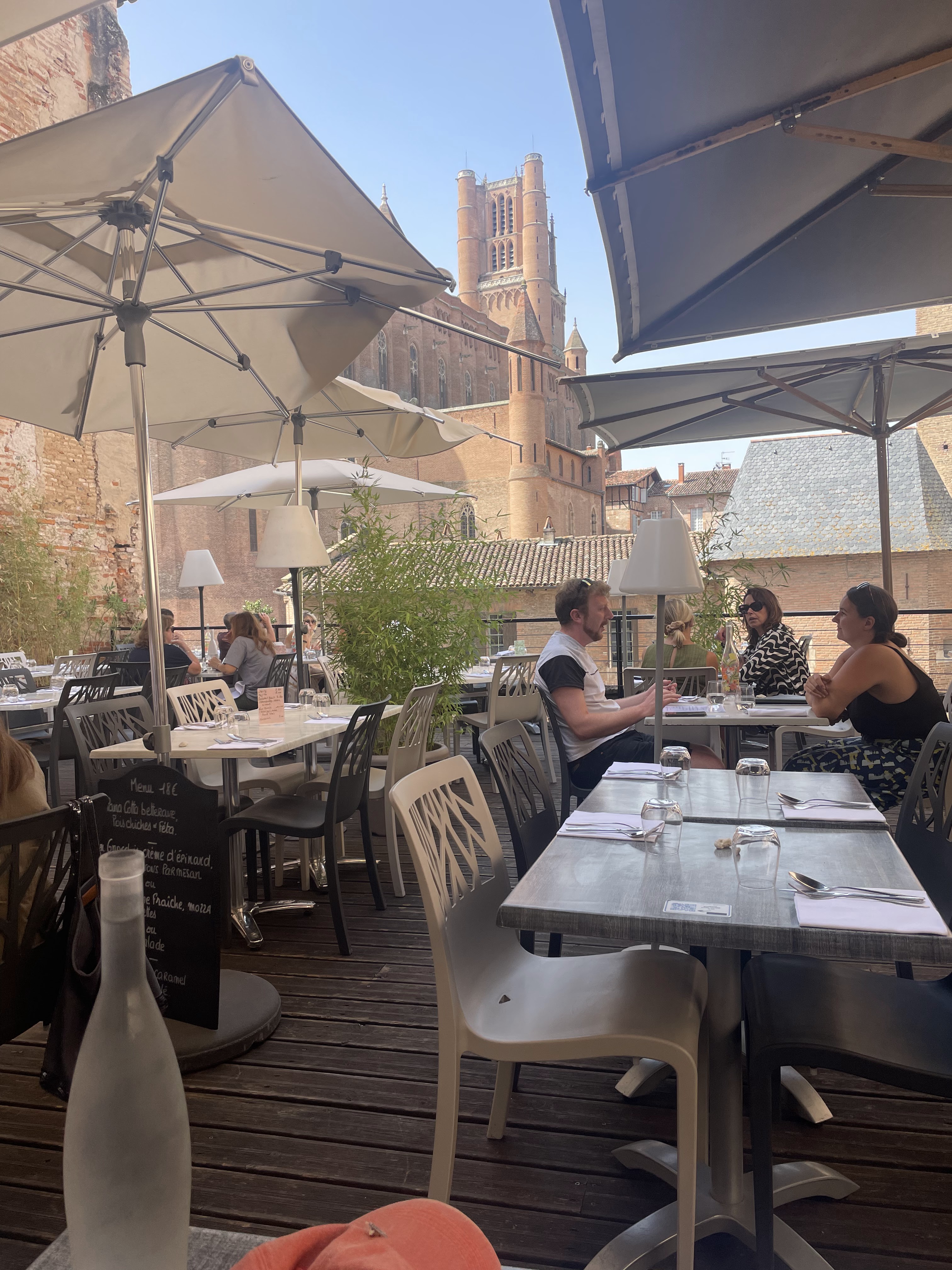 Super restaurant qui allie emplacement de rêve et cuisine délicieuse. Terrasse énorme mais calme avec vue sur la cathédrale Ste Cécile. Cuisine originale et savoureuse, qui associe des produits frais de saison de manière très équilibrée et riche en saveurs. J'ai adoré de l'entrée jusqu'au dessert, et aimerais bien goûter le reste de la carte. Service impeccable et efficace. Expérience à ne surtout pas manquer!