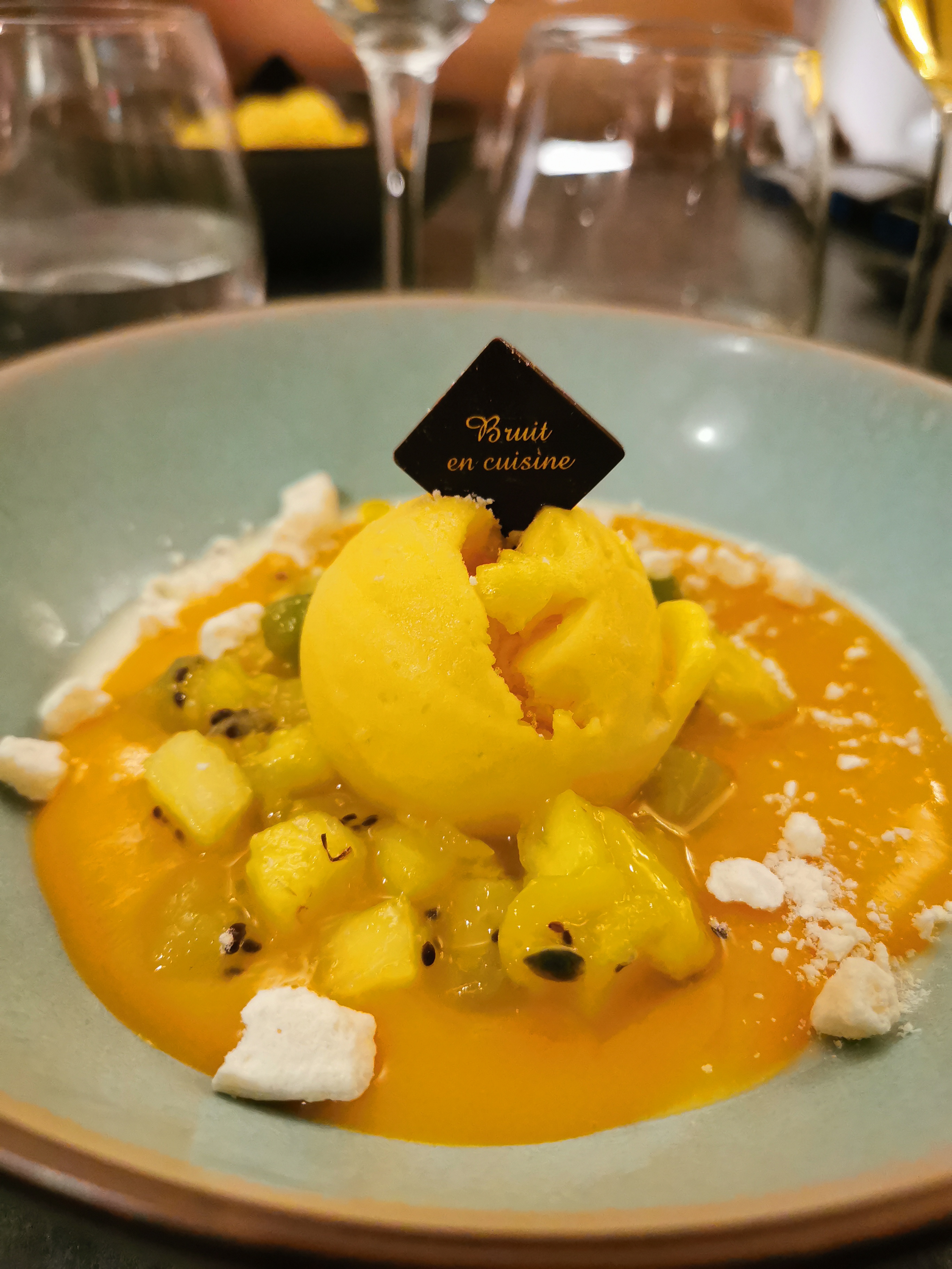 Ma soirée dans le Restaurant le Bruit en Cuisine est un sans faute. Superbe présentation et plats succulent Une merveille la soupe froide. Il mérite largement le 5* Seul petite déception, pas de titre restaurant le samedi soir, ni de chèque vacances. Dommage pour le pouvoir d'achat Les prix sont très raisonnables et la vue Grandiose