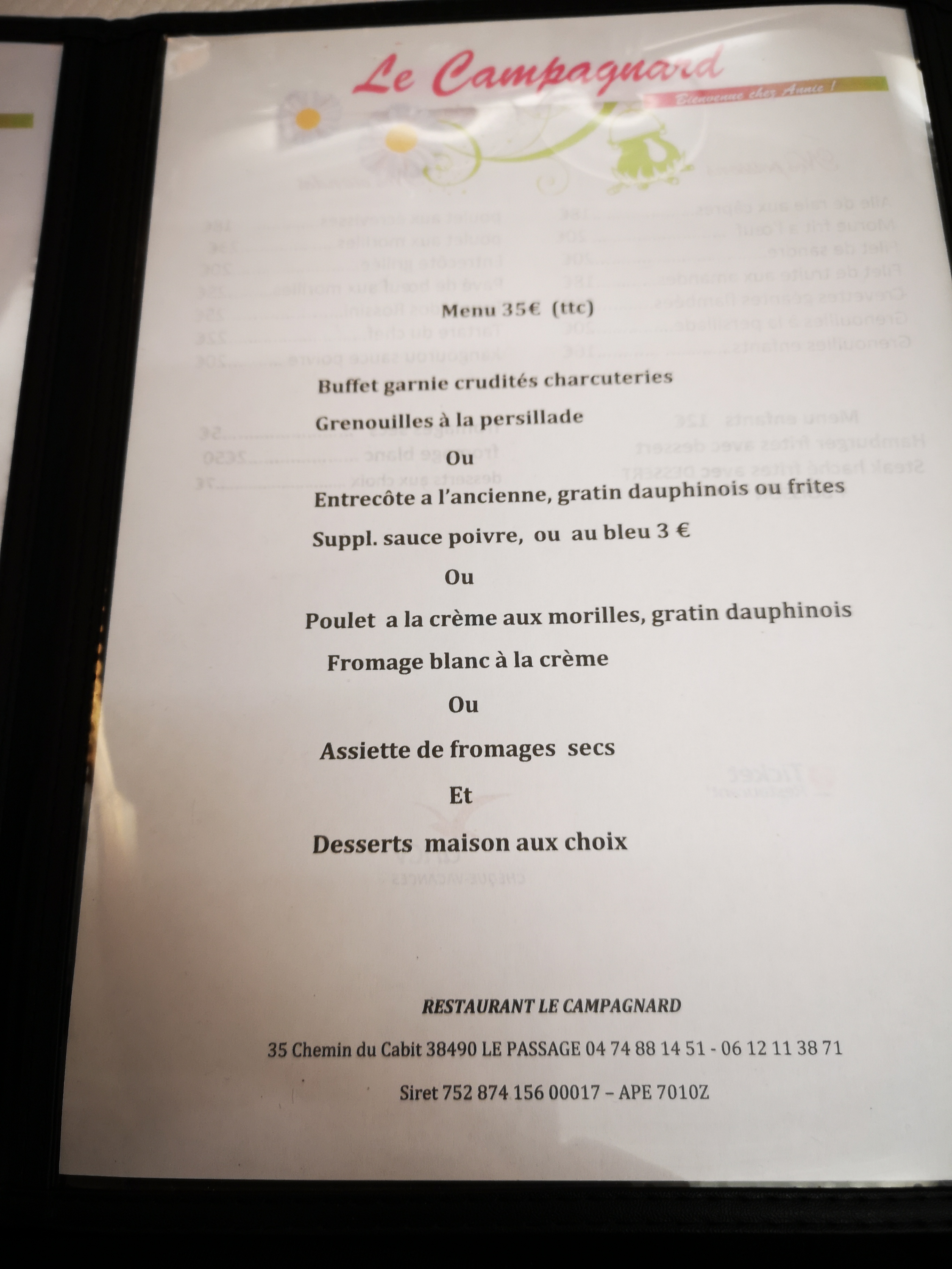 Alors que je commençais à m'inquiéter pour mon déjeuner, j'ai suivi les indications et me suis donc installé à Le Campagnard. On est un peu comme à la maison, reçu avec un large sourire et tout le monde semble se connaître. La cuisine est traditionnelle et en quantité largement suffisante pour ne pas se faire attraper par un besoin de sieste ! Merci à ces artisans qui maintiennent la vie dans les villages !