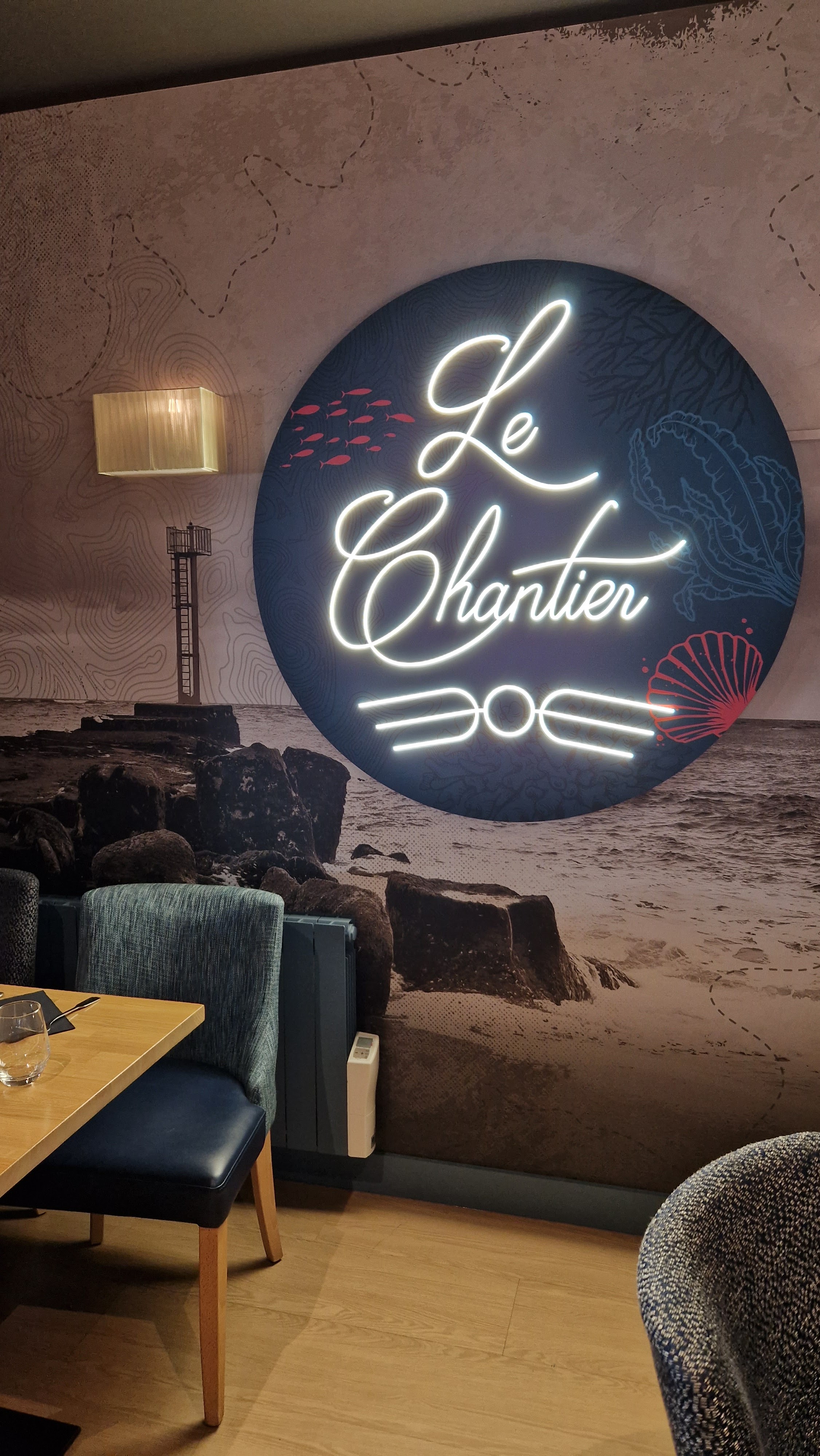 Le Chantier est l’un des rares restaurants ouvert au mois de Novembre. Après une balade dans la Ria d’Etel par un vent glacial mais revigorant, nous avons trouvé ce bistro moderne chic à la décoration apaisante. Néanmoins, les plats divergent avec le decorum. Deux menus sont proposés: 23,50€ ( Entrée plat et dessert ) 18,50€ ( Entrée-plat ou Plat-Dessert). Sur la photo ( Cabillaud / Potimarron), mon assiette semble assez vide mais ne vous en déplaise, la cuisine était raffiné et maison à contrario du dessert (profiteroles) dont les choux étaient de produits industriels. Bonne adresse mais des efforts à faire sur la carte qui jure avec la décoration de l’établissement. (Le choix des boissons et desserts sur des cartes plastifiées tel un café-pmu de plage). J’ai remarqué la présence de tireuse à bière au bar mais aucune proposition sur la carte ? Service plus qu’agréable. Merci