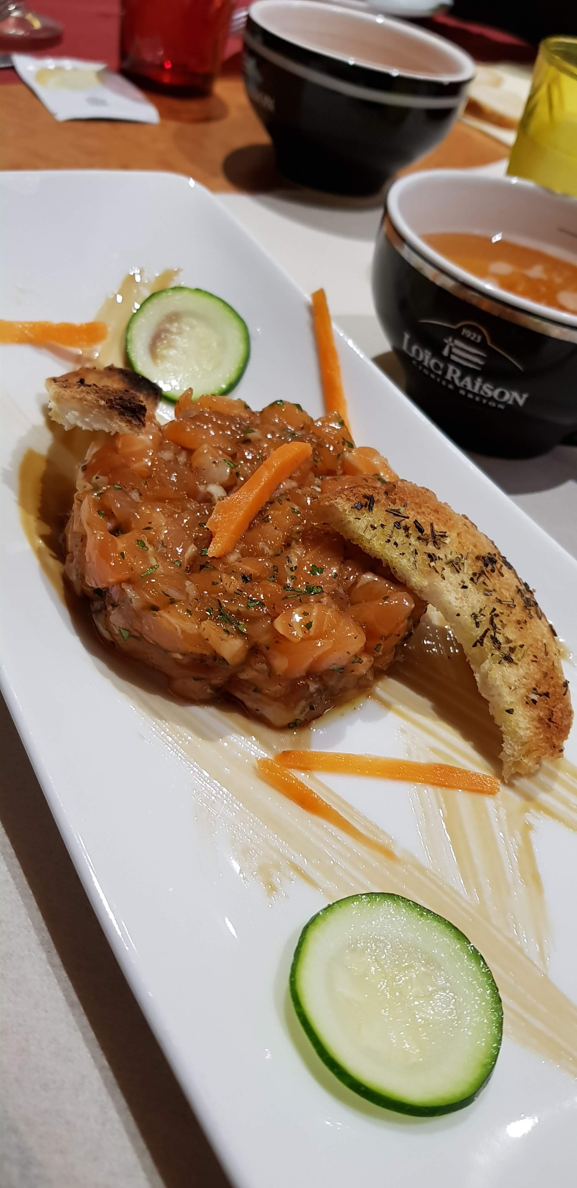 Nous avons pris les menus à 23.5 qui est d'un sens comme de l'autre le seul menu Question qualité cela reste correct mais sur le plan quantitatif cela est incorrect Nous avions pris du saumon (genre à l'aneth) Nous avons eu que trois petites lamelles de ce poisson. La désignation du plat principal n'était pas ce que l'on nous a servi un filet de cabillaud extra fin avec la peau donc pas grand chose à déguster dans l'assiette juste chaud sur la carte marquée un dos de cabillaud .. Restaurant qui n'est pas à retenir