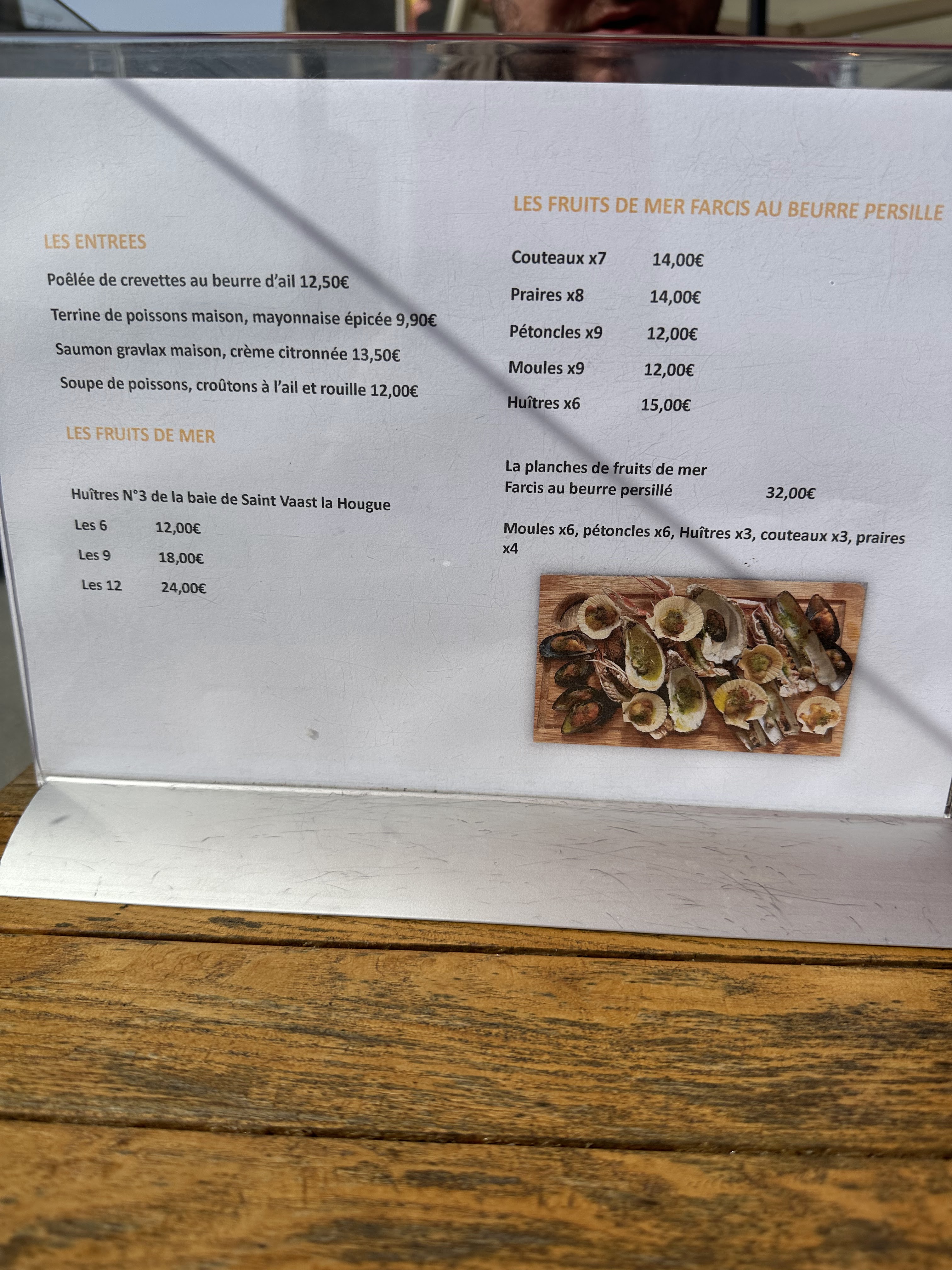 Vraiment déçue de mon plat de choucroute de la mer à 27€. Vu le prix, je n'ai pas pris d'entrée me disant que ce serait vraiment copieux. Non seulement pas copieux mais vraiment pas terrible hormis les 2 St Jacques. Sauce au beurre blanc très moyenne , 3 moules, 2 mini mini pommes de terre, un petit bout de poisson blanc et de haddock fumé, le tout vraiment bof. Et que dire de l'unique gambas ultra blanche décongelée... Du coup, pas de dessert, juste envie de partir vite et pas envie de se faire avoir là dessus aussi. 2 points positifs, le rosé et l'andouillette. Et pour ceux qui aiment le naturel, lampe remplie de saletés et de toiles d'araignées tout près de la table. Trop, c'est trop, jamais je n'y retournerai. Peu/pas de menus dans les restos de Barfleur, dommage. On accepte toujours de payer quand ça le vaut...