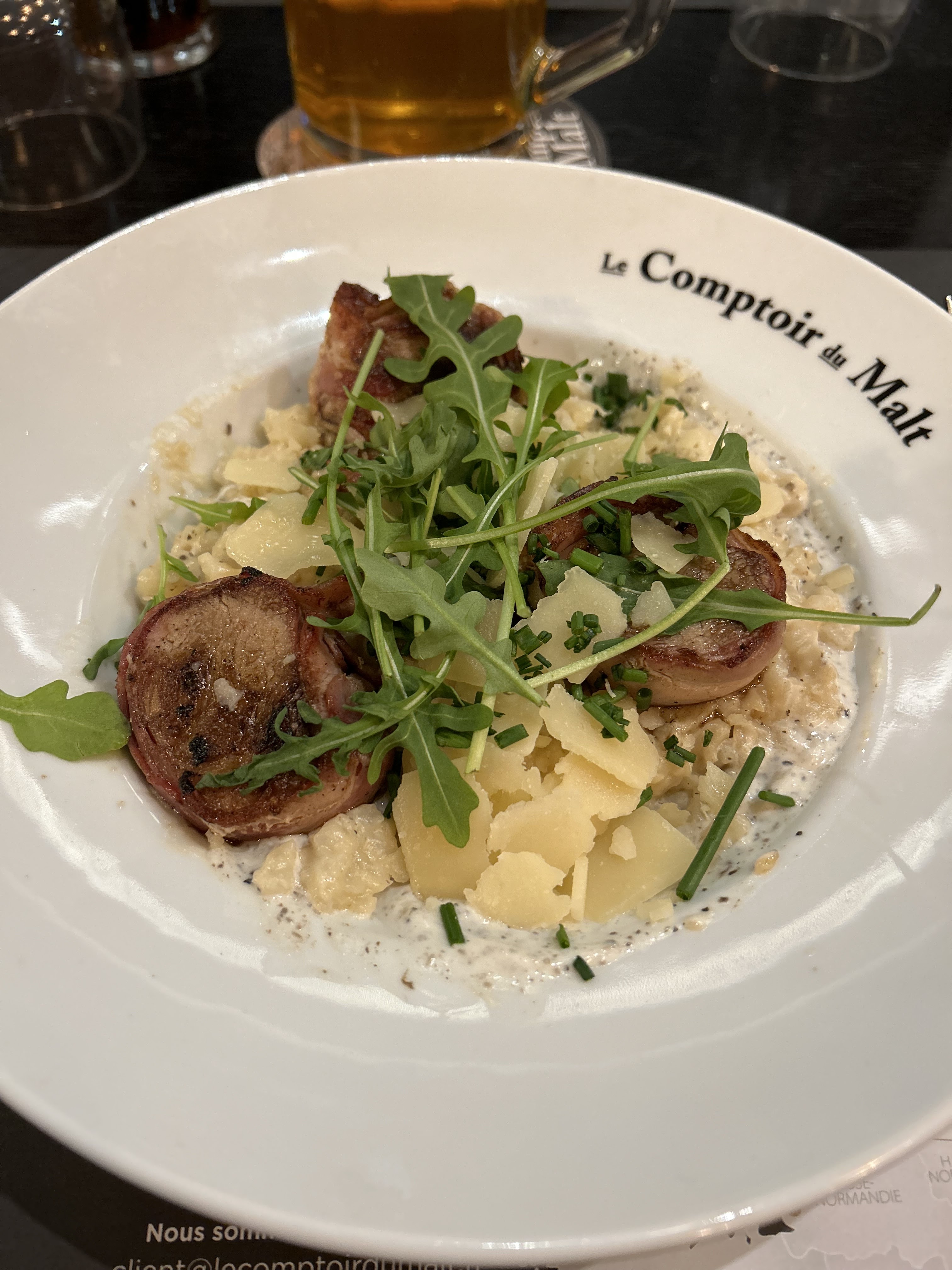 Posté le 04/12/2024 à 20:42"Filet mignon de porc gratiné au maroilles ,lard fumé et frite, dessert brioche façon pain perdu. Avec une très bonne bière dont j'ai oublié le nom , mais du coin..."
