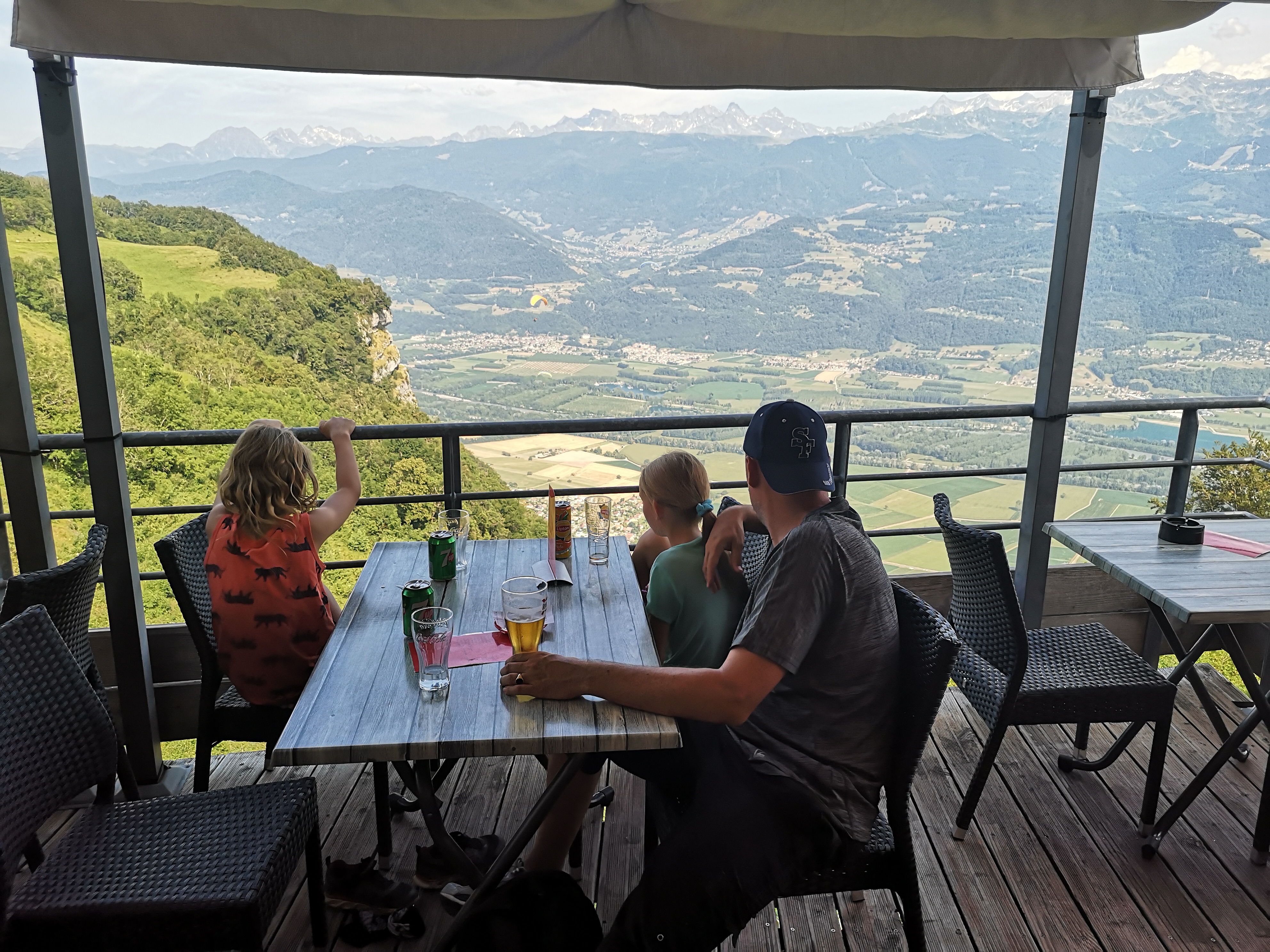 Belle terrasse mais nous n'y avons eu droit (une table de 2 est restée libre pourtant...). En arrière plan, les parapentes vont et viennent, accueil cordial, tarif un peu élevé mais les assiettes sont copieuses. Dommage que la salade ne soit pas fraîche et que le plateau de notre table (à côté du transfo haute tension du téléphérique qui ronronne) ait un jeu important sur son pied (il a fallu se coordonner pour manger). Nous avons passé un moment agréable malgré tout.
