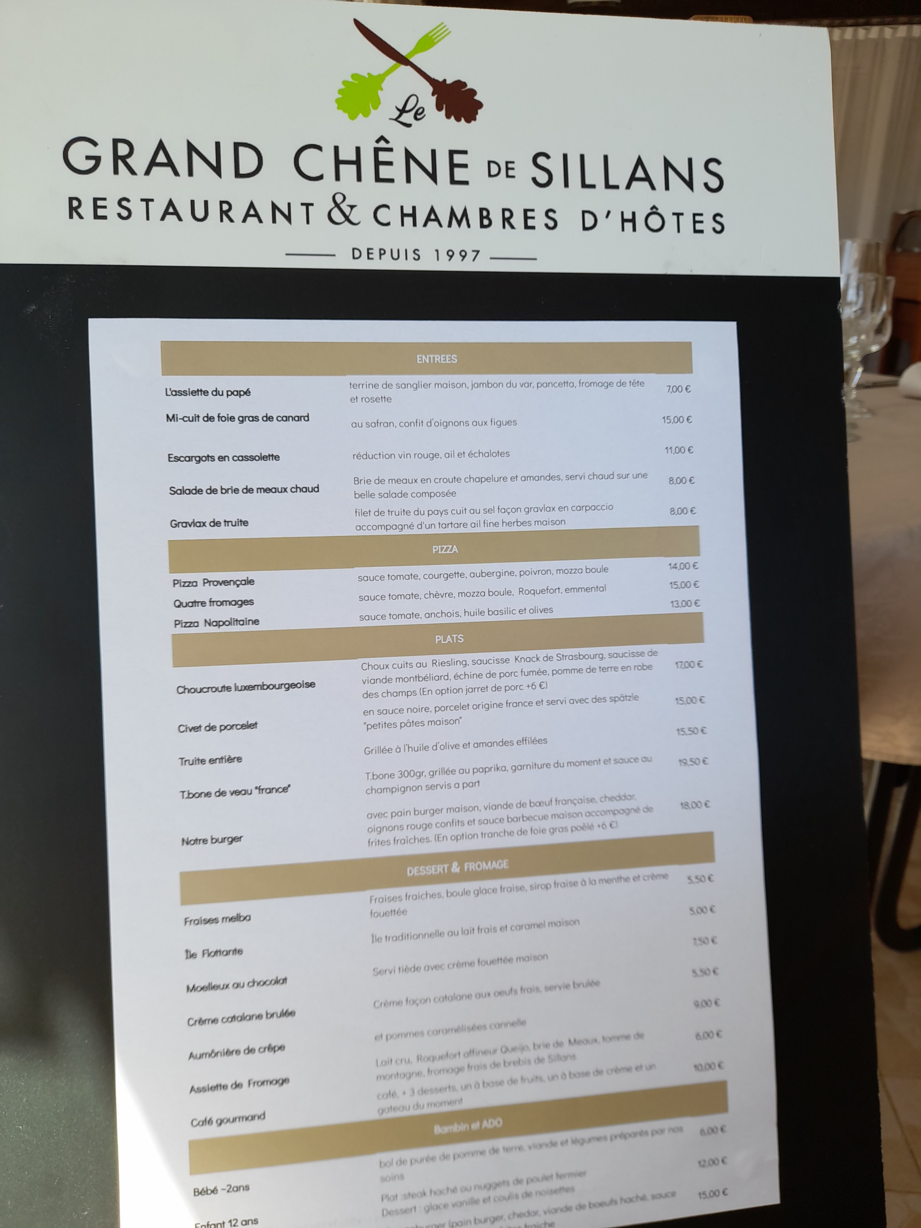Bonjour. Nous avons passé le réveillon du nouvel an au GRAND CHÊNE DE SILLANS et tout était PARFAIT. L' accueil, le repas, l'animation dansante. Tout était très bien ORGANISÉ. Pas d'attente interminable entre les différents plats. MENU ABSOLUMENT DELICIEUX. NOUS RECOMMANDONS VIVEMENT L' AUBERGE DU GRAND CHÊNE À SILLANS LA CASCADE.