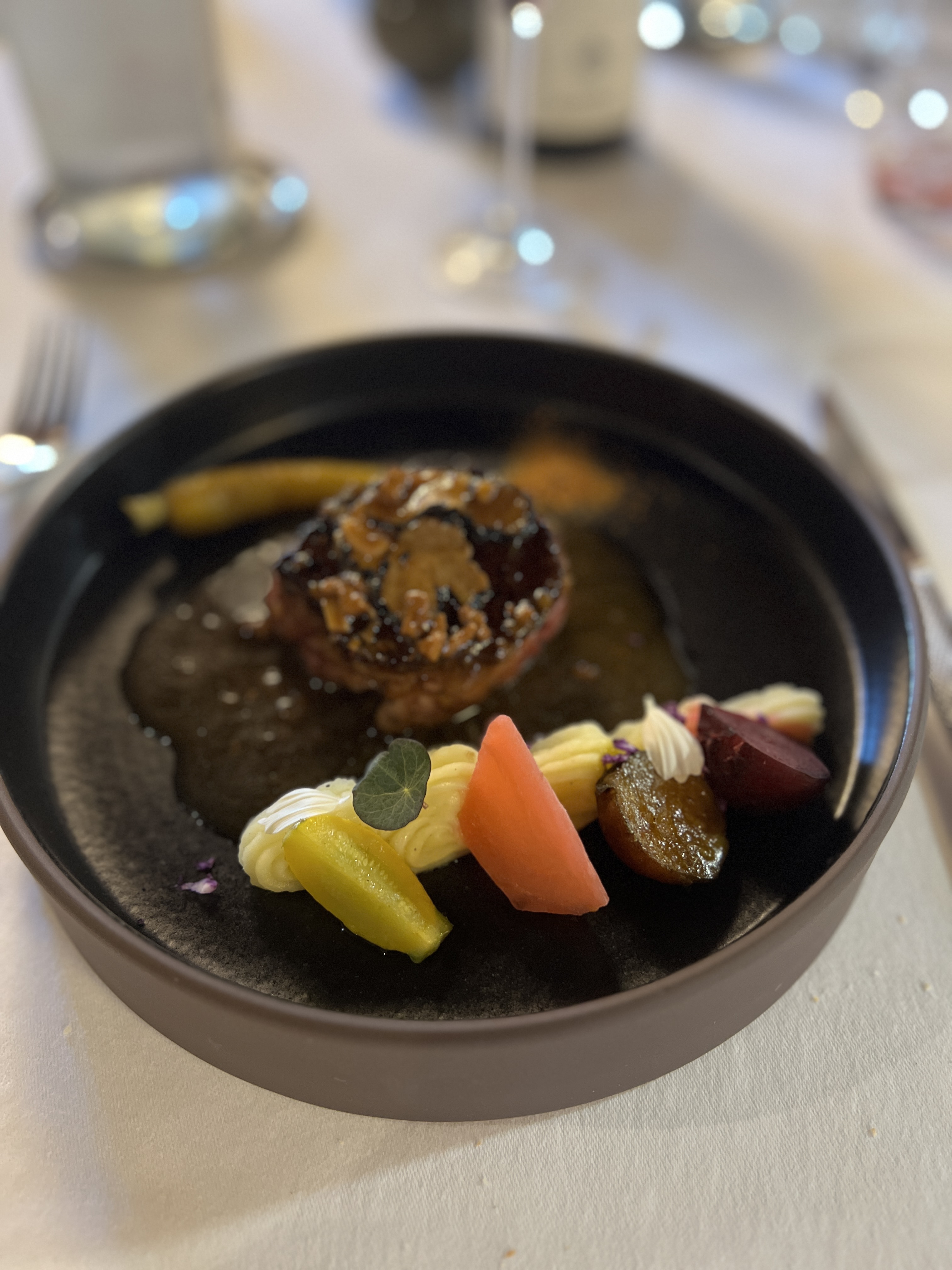 Super endroit chaleureux un beau feu dans la cheminée et un feu d'artifice tout en douceur et accords dans l assiette. Premier menu top . Une agape pour l apéro, un amuse bouche, une joue de porc extraordinaire un dos de cabillaud parfait fromage bien et une pavlova qui n a qu un défaut celui d être trop petite. Nous reviendrons pour le menu dégustation a 68€. Le menu intermédiaire me fait moins envie. A faire et refaire