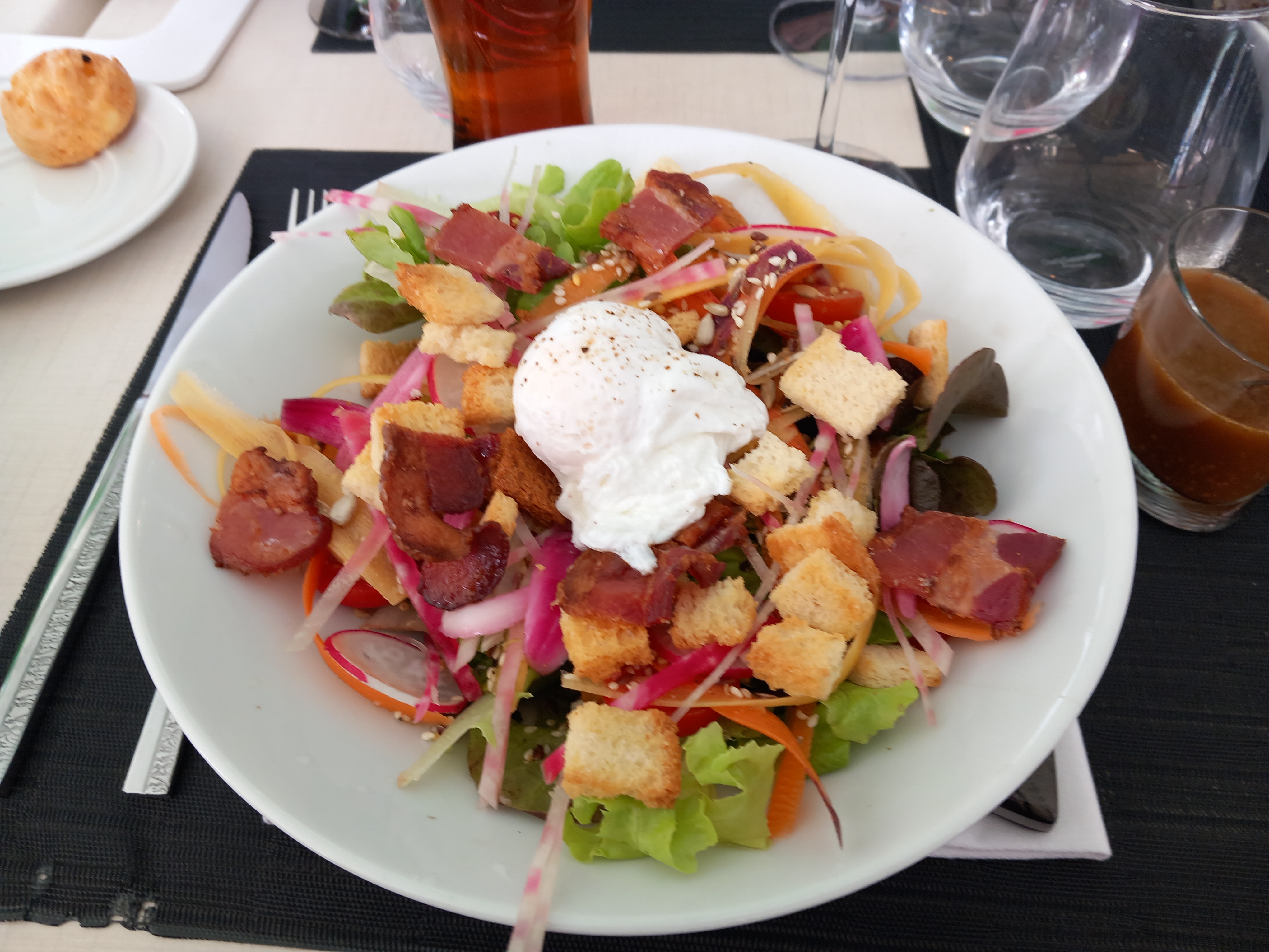 Posté le 12/06/2023 à 10:01"Décu, pas possible de réserver la table souhaitée, leur site annonce un menu week-end à 28€ mais, surprise, sur place, proposition supprimée, reste la carte. boissons commandées pour l'apéro arrivent en meme temps que les entrées : salade campagnarde (beaucoup de salade, 5 ou 6 feuilles à cigarette de lardons quelques lamelles de carottes, dés de crouton du commerce et oeuf poché froid) plat poisson ombre filet mince comme une feuille de papier - plat friture d'ablettes quantité digne d'une entrée c'est à dire maigre portion. le pain et la caraffe d'eau sont arrivées après plusieurs réclamations (heureusement que nos voisins de table nous ont dépannés pour le pain) On s'est passé des desserts car on en avait assez vu. A fuir"