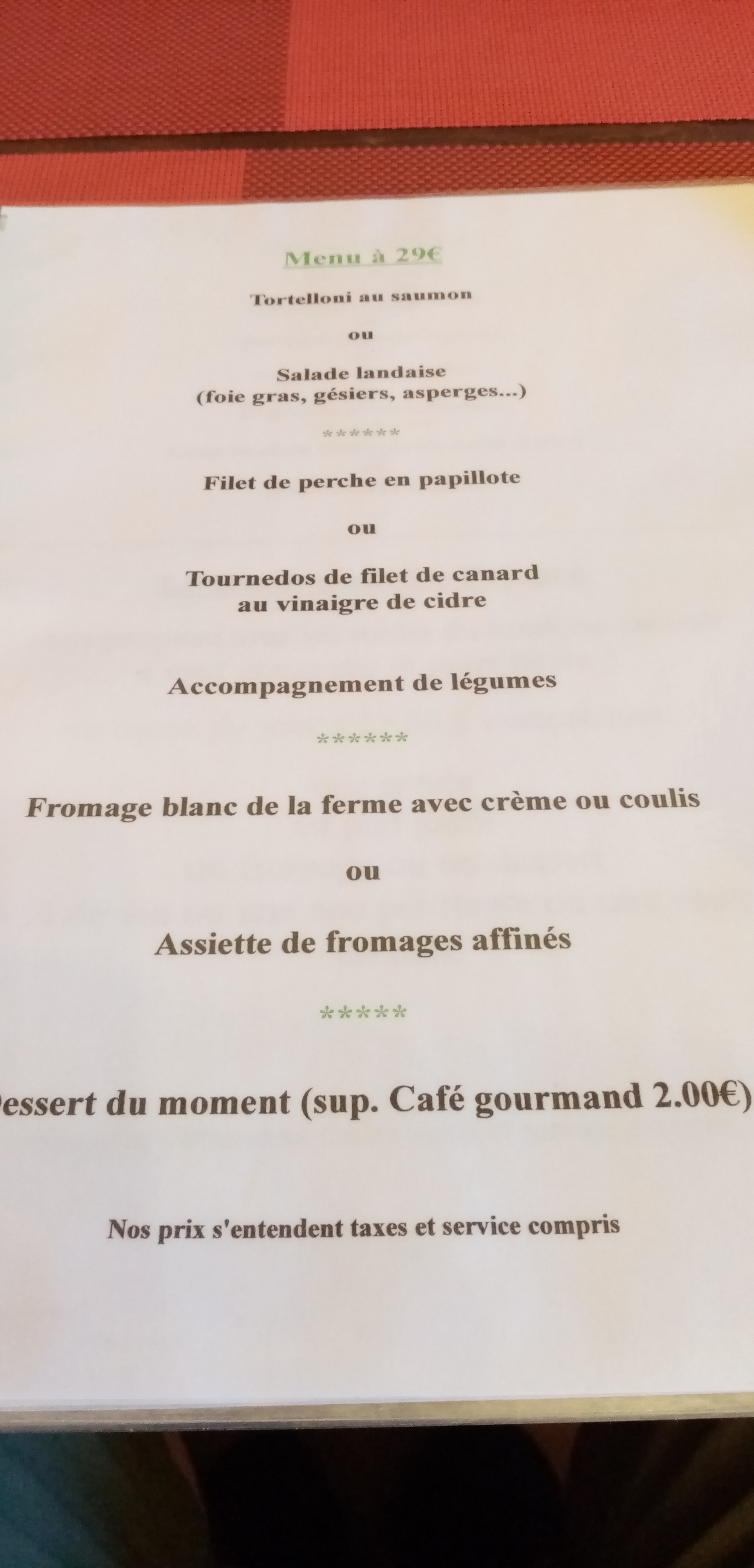 Menu du jour correct et abordable malgré une entrée un peu bâclée ( quenelles sauce tomate dignes d'une cantine d'école). Le dessert remonte le niveau. L'accès à la salle du premier étage, seule salle ouverte ce jour là, est à proscrire pour les personnes ayant des difficultés de déplacement. Sinon, le service est agréable, et, chose rare, on sait prendre en compte les intolérances au gluten.