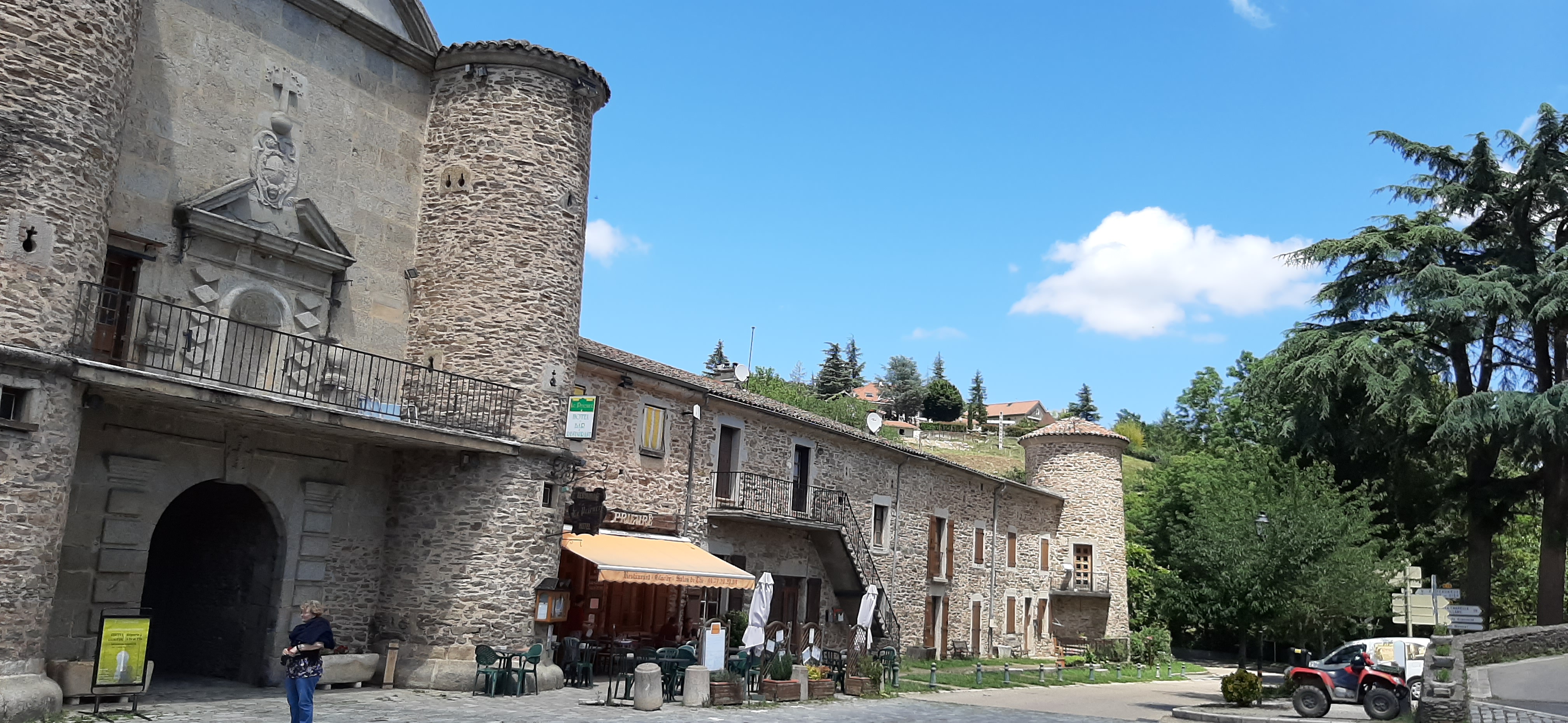 Après avoir visité ce superbe village nous étions enchantés de pouvoir manger un plat typique sans avoir d'attentes particulière sur celui-ci. Même si nous sentions que ça n'allait pas être la meilleure table au monde. Quelle ne fut pas notre surprise, ce n'était effectivement pas la meilleure, c'était sans doute la pire table que nous avons eu l'infortune de découvrir !!! Nous avons choisi les spécialités de la maison en pensant naïvement que celles-ci étaient maitrisées par les tenancier de l'établissement. Que nenni !!!! 2 hamburgers à base de pain premier prix que l'on trouve dans toutes les grandes enseignes de distribution accompagnée d'une DÉLICATE pièce de viande hachée et reconstituée, TOUJOURS des grandes enseignes de distribution ! Le tout accompagné d'une salade défraîchie, noyée par une émulsion de vinaigrette industrielle et de terre du Pilat. Mon estomac se convulse encore à l'idée des tripes que mon père a tenté d'ingérer, restées bloquées aux portes d'une probable et vilaine occlusion intestinale. Si par malheur vous vous retrouvez comme nous, à avoir faim après 19h foutez le camp, fuyez, ne vous retournez pas !!!!!!!!!!!!! Ce sera tout et c'est déjà pas mal. Pour 50€... Bon appétit.