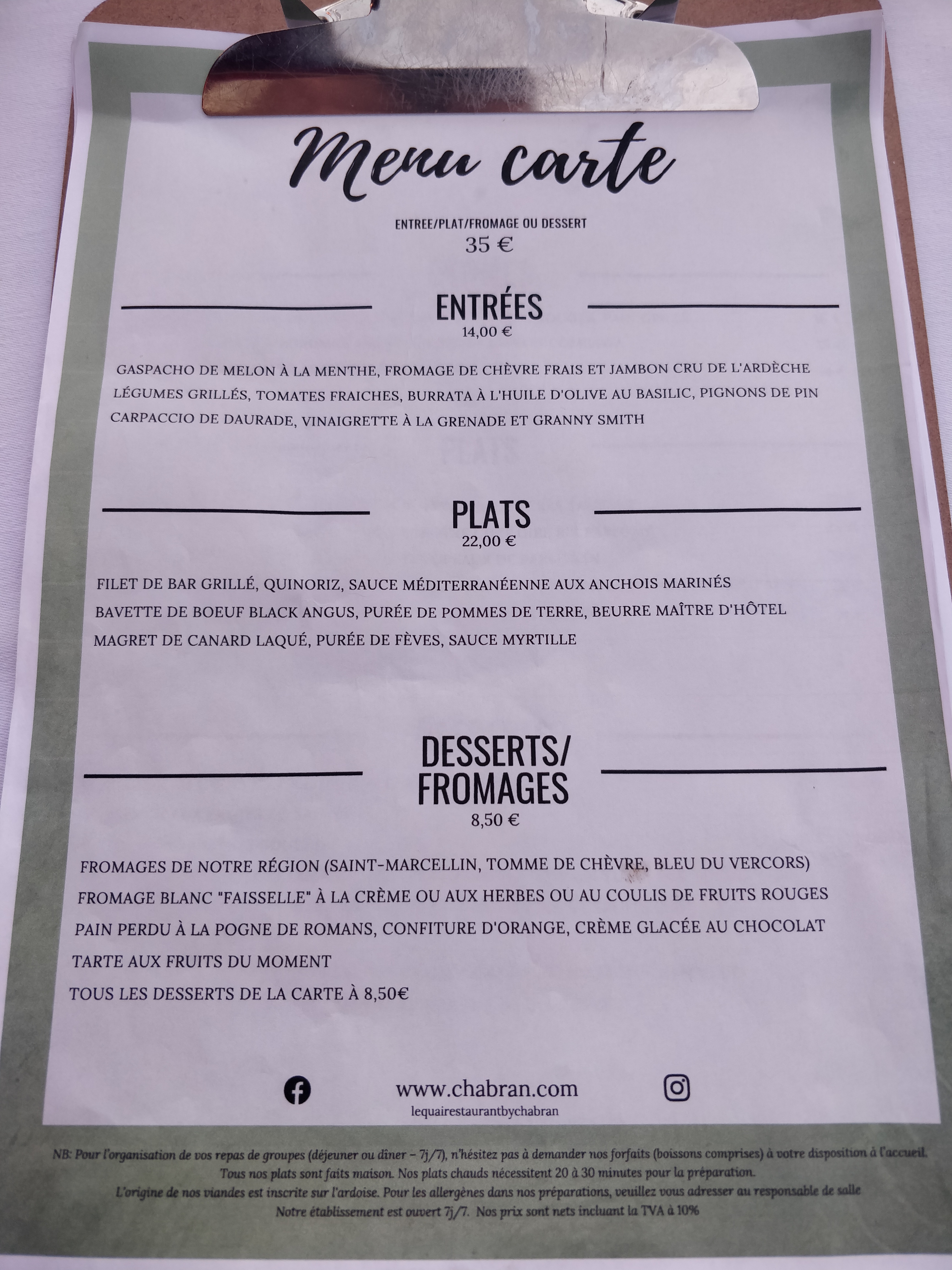 Très bon restaurant Chabran que je recommande ! Il est très bien situé, avec une belle vue face au pont ! Nous avons mangé en terrasse pour le dîner et avec le coucher de soleil c’était magnifique ! Le personnel est très à l’écoute et très gentil (nous avons demandé au moins 4 fois de l’eau et ils nous en ont apporté à chaque fois en gardant le sourire ahah). Nous avons pris de la seiche qui était succulente ! Coup de coeur pour le fondant au chocolat Valrhona servi chaud et coulant qui vaut le détour 🤤🤤