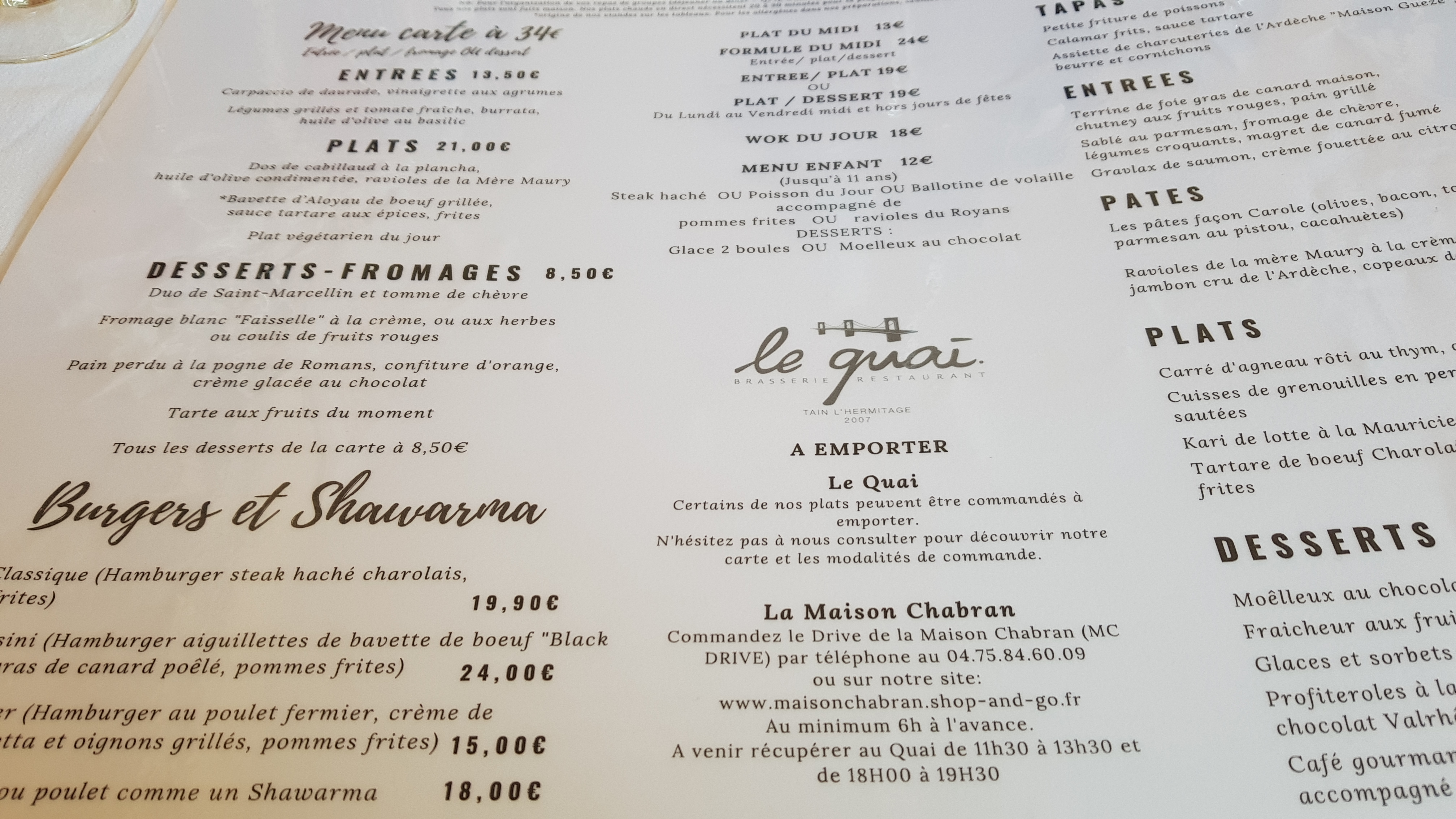 Après avoir cherchée un bon restaurant le dimanche soir, nous avons réservé au Quai. Un menu excellent, des serveurs aimable et souriant. Petit bémol la terrasse extérieur côté passage piéton , mais grâce à un désistement j'ai eu une table extérieur terrasse. Je recommande