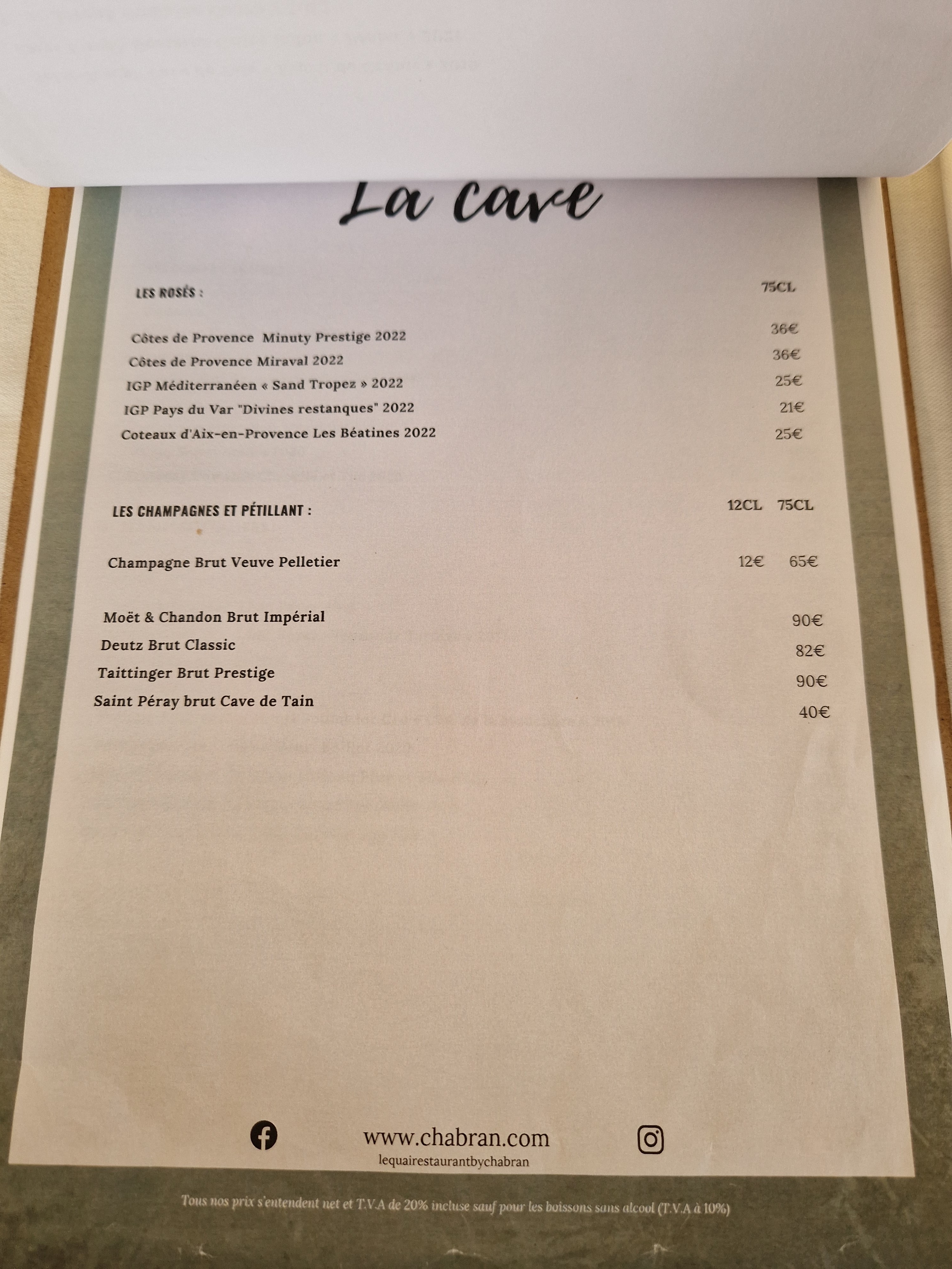 Très déçus d'un repas avec des amis un dimanche midi. Qualité de la cuisine très moyenne et quantités très limites. Le personnel est lui aussi trop moyen. De plus, attention : si vous décidez de remplacer les entrées prévues dans le nenu car vous ne les aimez pas, en choisissant parmi celles proposées à la carte, vous aurez une surprise très désagréable au moment de payer l'addition. En effet, le plat et le dessert vous seront également facturés à la carte. Ce qui veut dire qu'au lieu de payer le menu 37 € + quelques euros pour la modification de l'entrée, nous avons payé le menu 53 €. Je trouve ceci pas très honnête, d'autant que lors de la commande, nous avions bien demandé au serveur s'il n'y aurait bien que le supplément de quelques euros pour l'entrée. Le personnel Nous ne reviendrons pas, car prix trop élevés pour ce que nous avons mangé, la cuisine est insipide et pas digne d'un restaurant du nom de Chabran !