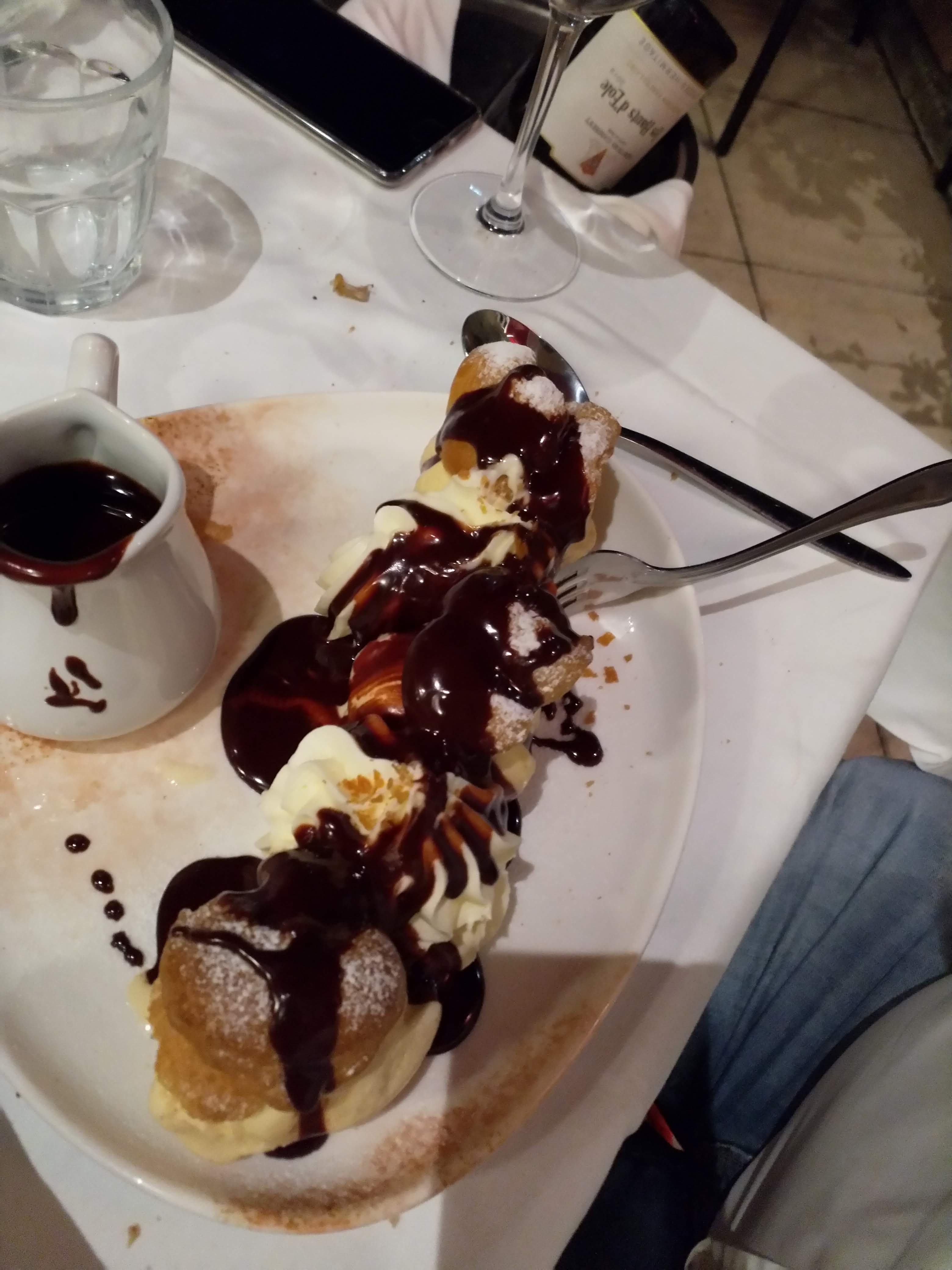 En entrée des cuisses de grenouilles délicieuses (comme à la maison). Ensuite un tartare de bœuf bien épicé accompagné d’une salade (fraîche) et et de frites (bof). A retenir l’accueil chaleureux et professionnel et surtout les profiteroles au chocolat.