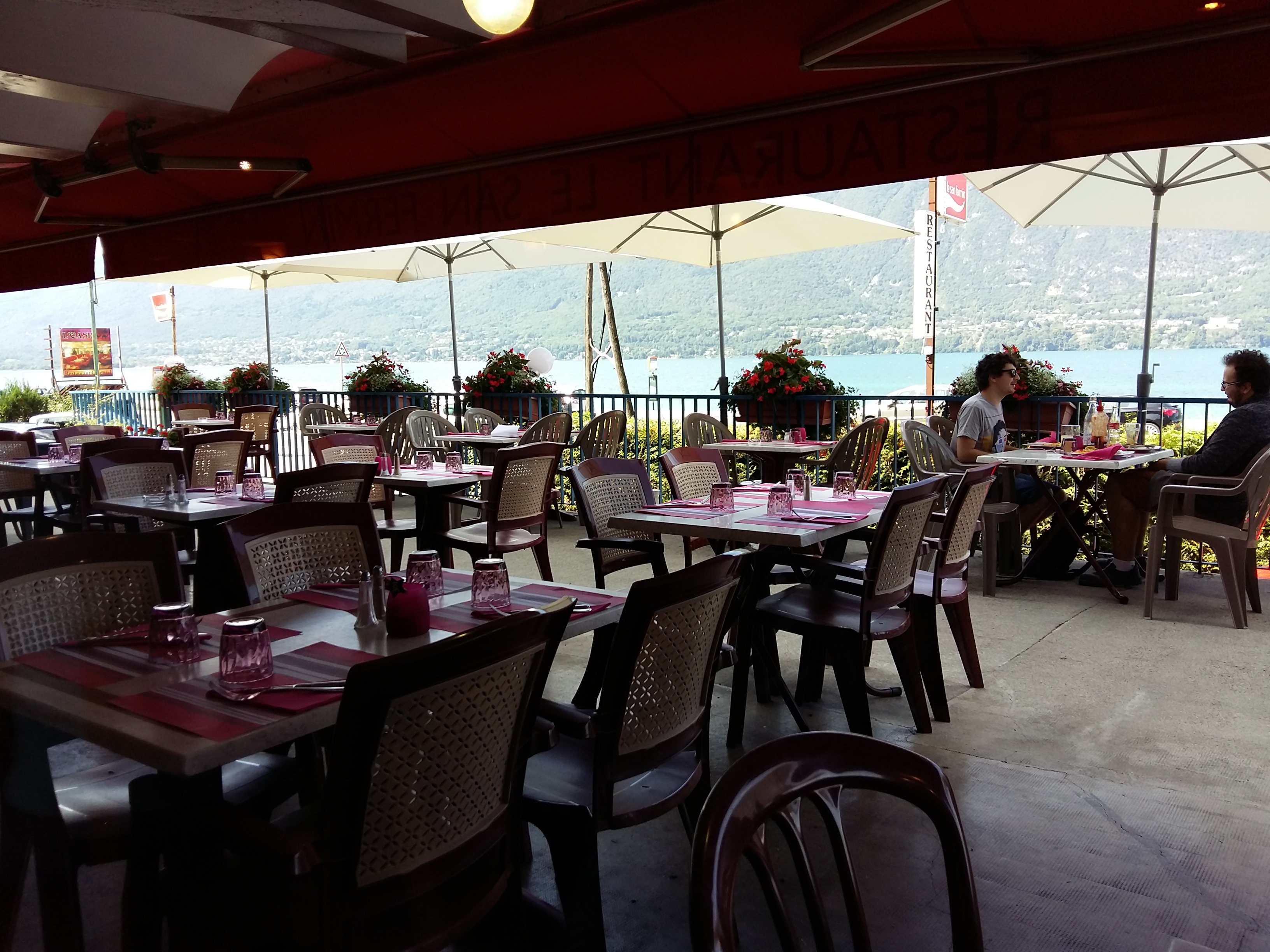 Restaurant sympathique, manger pour pas si cher que ça (selon mon avis) sur les bords du lac, ceux qui cherchent le calme, éviter avec la route mais ce n'est pas si audible et si désagréable que ça, ensuite le bâtiment est comme ça y a pas à chipoter, belle vue sur le lac, serveuses aimable, de bons vins, patron (je suppose) aimable, restaurant propre. Terrasse bien ombragé jusqu'à 13h, se placer prêt de la baie vitré pour bien rester à l'ombre. Nous y sommes allé en milieu de semaine à midi au début des grandes vacances scolaires, pas forcément besoin de réserver. Service dans de bon temps.