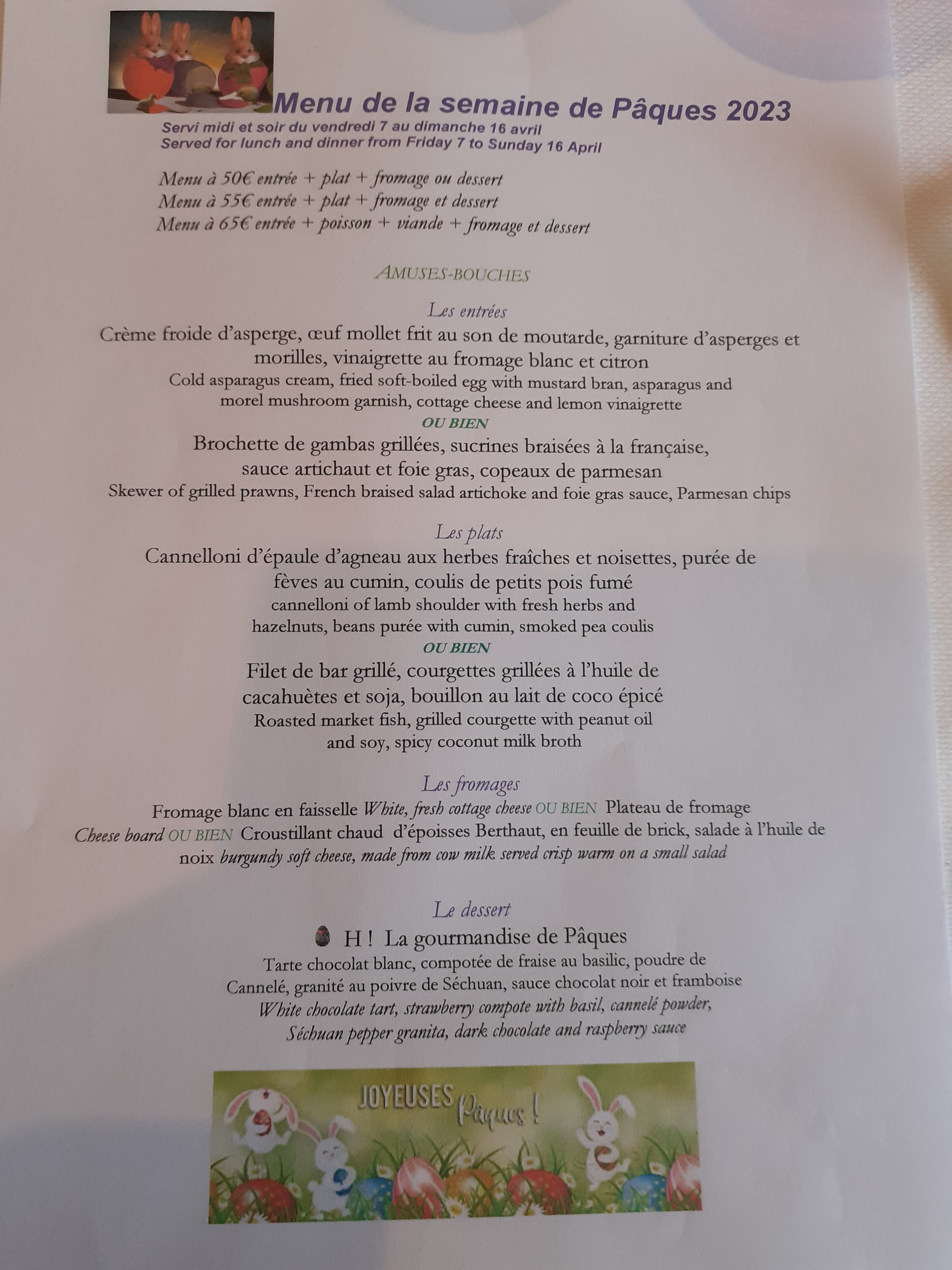 Choix de menus de qualité à des prix raisonnables, vins excellents à la carte, très bon accueil et cadre agréable.