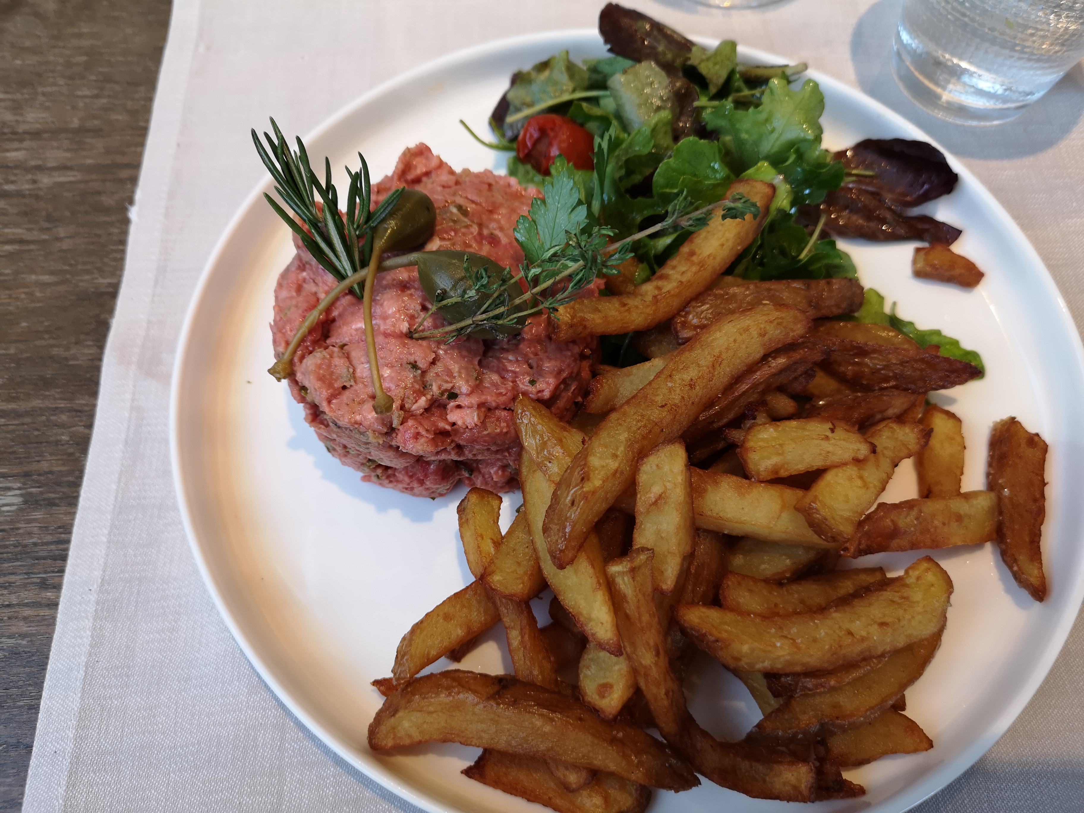 Très sympathique restaurant intérieur très propre bien agencé et bien décoré Les assiettes ont une belle présentation et la cuisine est relativement correcte dans l'ensemble Néanmoins il est inadmissible de mettre à la carte : (pièces de boeuf sauce au poivre) et de servir un vulgaire steak pas très tendre de plus ou moins 100 grammes avec une sauce au poivre très liquide et sans goût Heureusement les frites sont bonnes ! J'estime que pour plus de 100€ à 2 personnes on peut s'attendre à beaucoup mieux