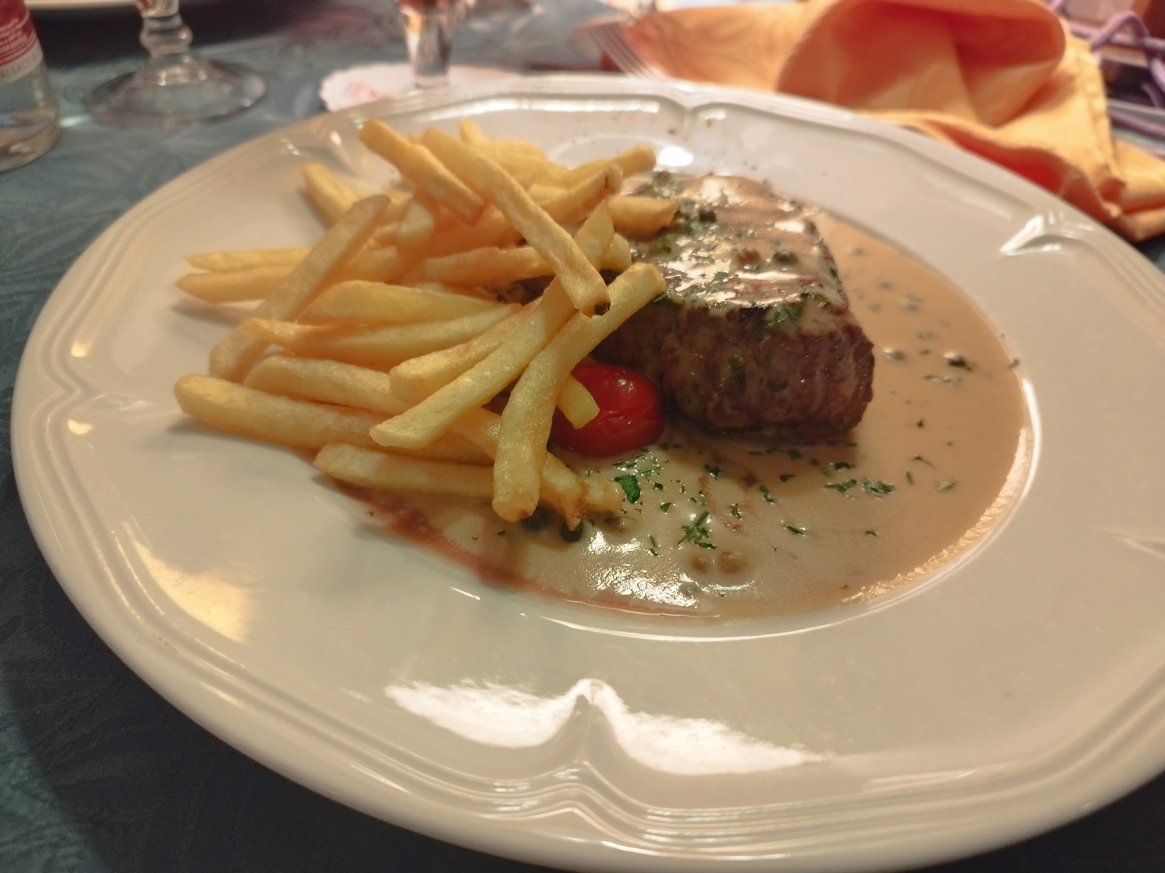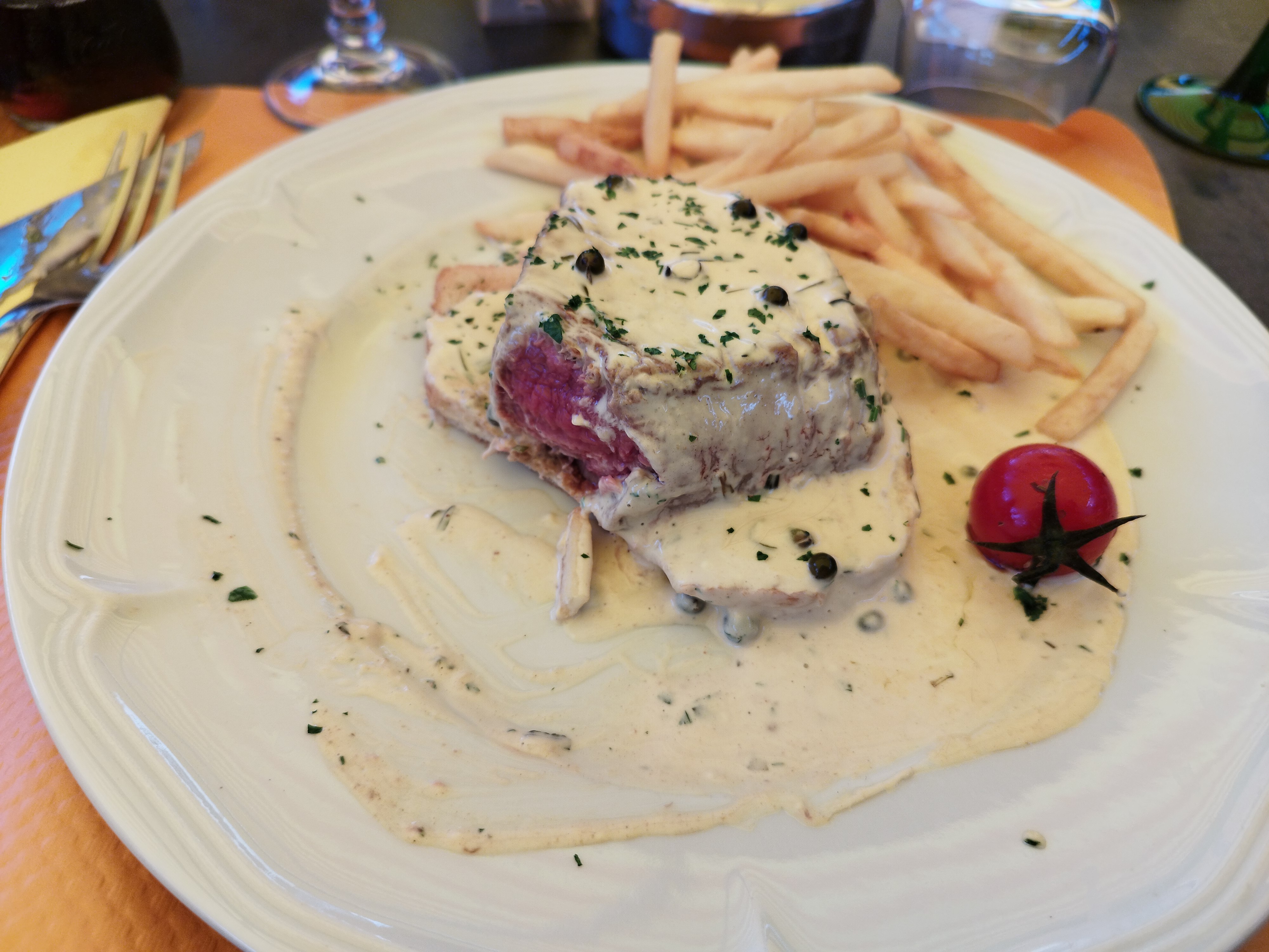 Nous avons eu le filet de boeuf qui était savamment préparé. Le service était excellent même selon les standards français et tout le monde était très sympathique. Notre chien était le bienvenu