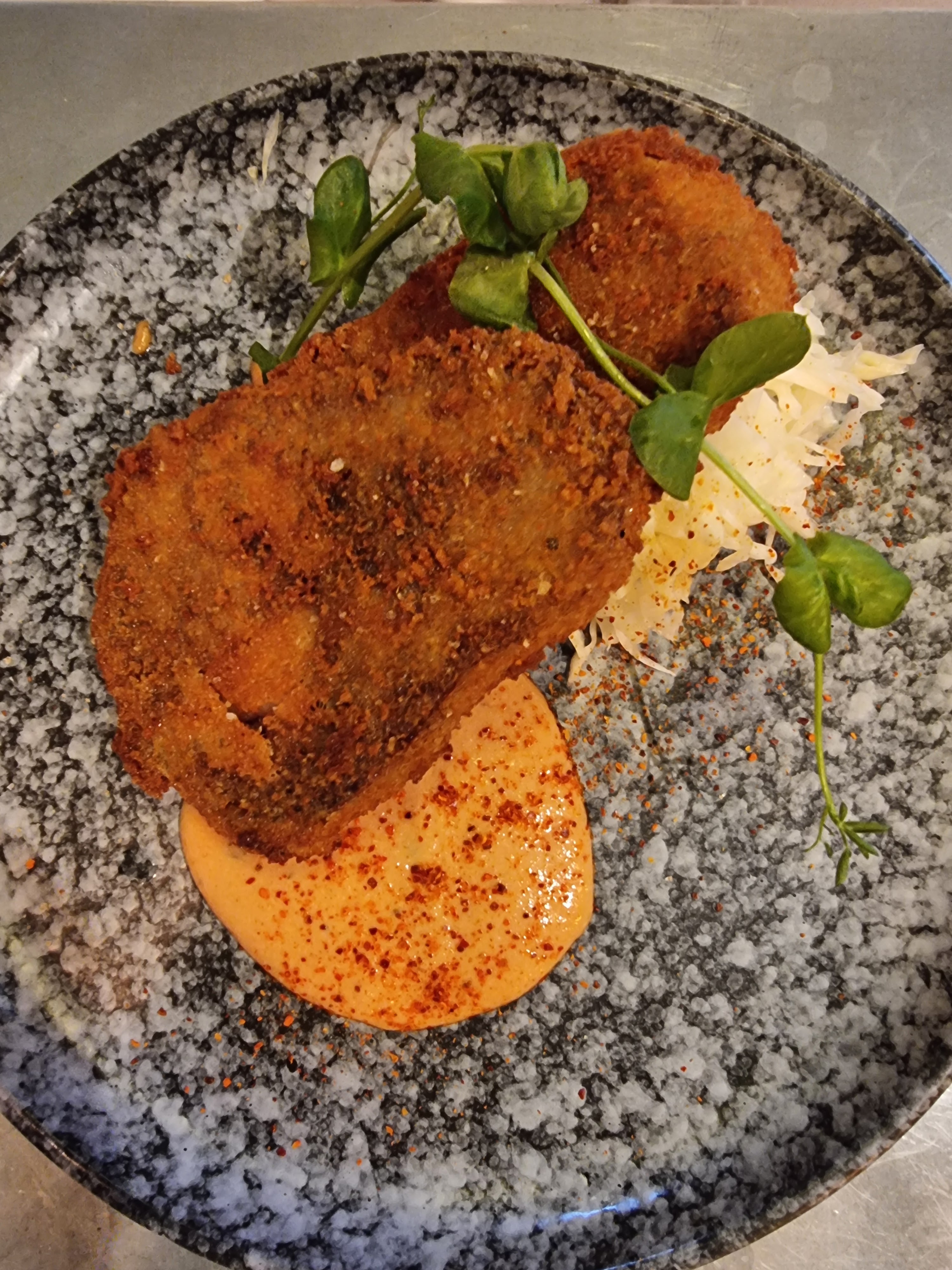 Cuisine raffinée et moderne C'est fût une halte non programmée et un réel plaisir gustatif. J'ai pris à l'ardoise un langue de veau panée avec ces frites de patates douces... un régal